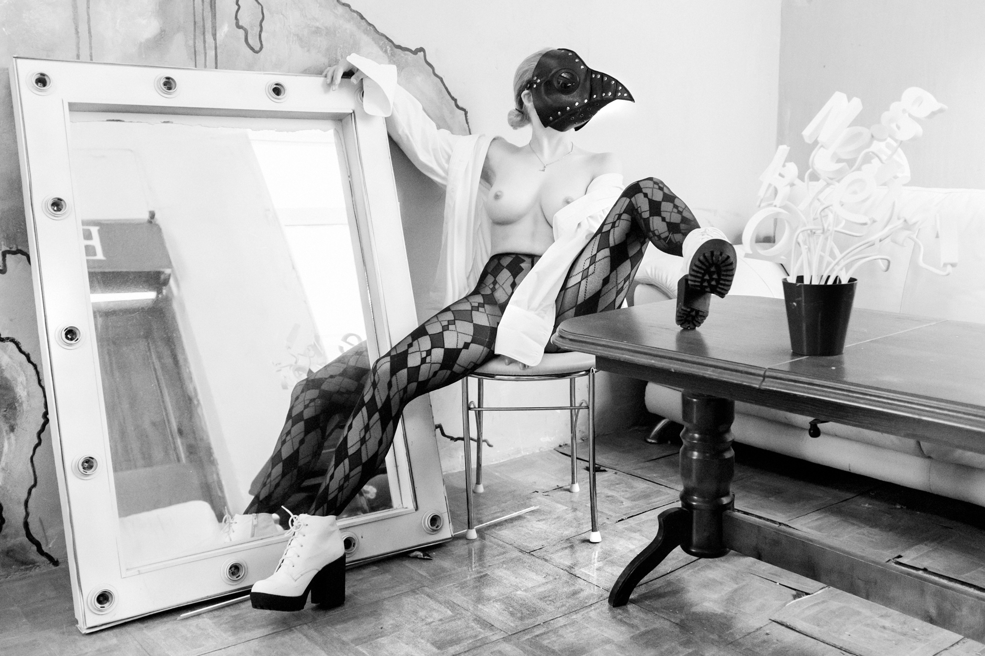 One more frame from recent art nude photoshoot. Some unusual location and outfit including Doctor Plague mask.