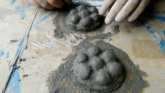 Now it's time to start with the flowers, we make some cement balls, we take one and position them in the center, then we arrange others around it, and we give the shape of the flower, once they are in place, add a cement paste and shape by removing the surplus