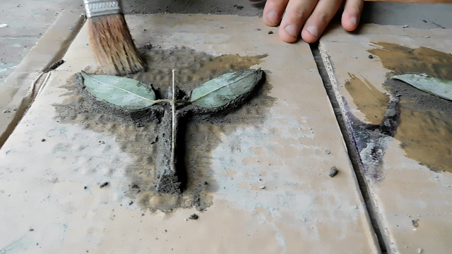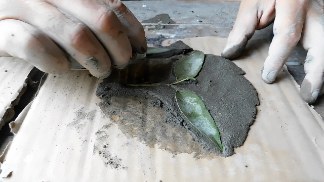 A flower cannot be complete without its leaves and stems. We start by making a cement paste, we apply pressure with our hands, as a reference we take a leaf and a real stem, we pose on the paste and we apply pressure, now with something sharp we remove the surplus and they will have the shapes they were looking for.