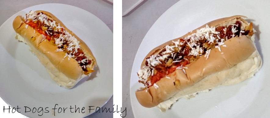 We take out our breads, put the sausage in the center and add the food chopped in step 1, then our sauces (tomato and mayonnaise) if you want to add an additional is much better, finally we add cheese on top and serve.
