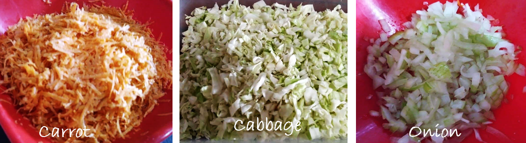 We wash the onion, carrot and our cabbage with abundant water, we peel and grate each one separately, we place it in a different bowl so as not to mix flavors yet. As shown in the picture below.