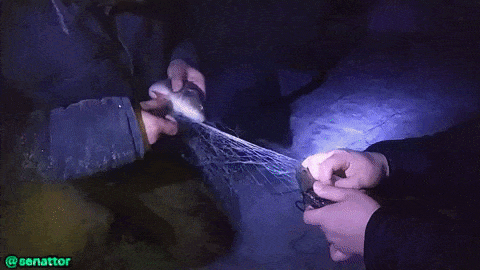 As you already know, I had a replacement actor. Therefore, I asked Vyacheslav to slowly pull out the fishing net, and if a fish appears, immediately slow down its movement to get a good shot. But there was an incident that, by the way, I was expecting. When the first fish appeared, Vyacheslav made a mistake and released it back into the hole. Stop the video. Effective shot.