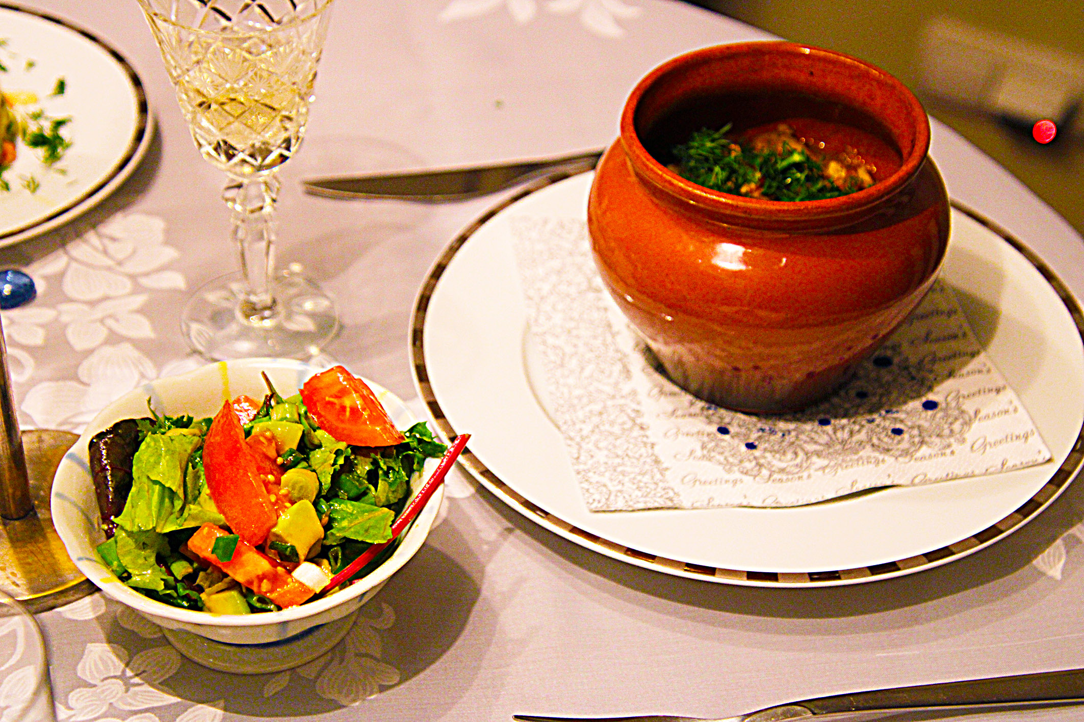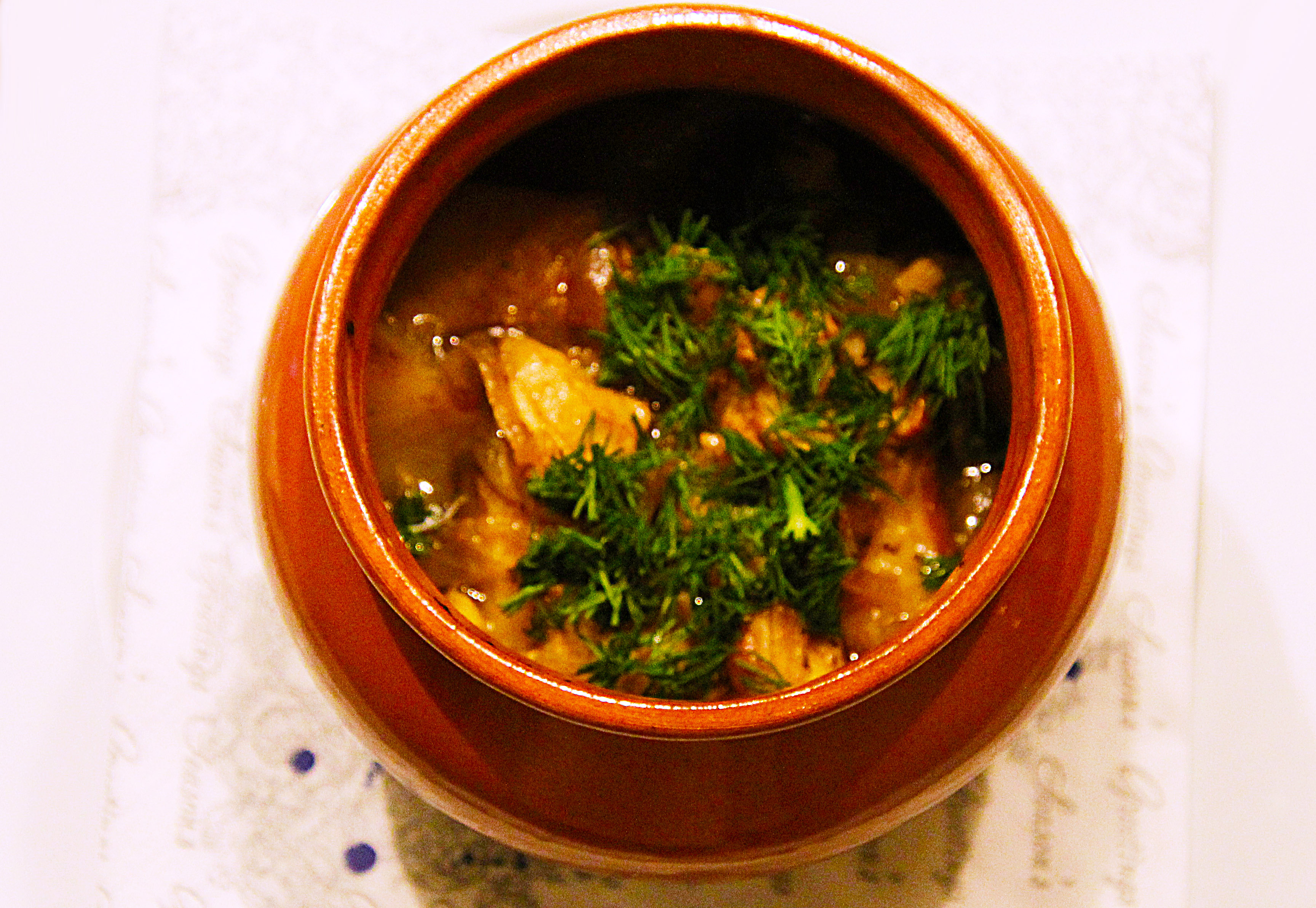 ... не могу не сказать пару ласковых слов за португальское рагу из кролика с яблоками томлёное в горшочках. Сразу оговорюсь - я не уверен, что оно "португальское". Скорее это уже давно типичное наше русское "мясо в горшочках с запечёным картофелем, яблоками и грибами, под соусом фейжоада"