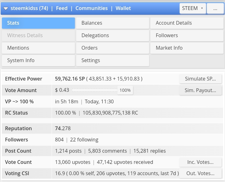 Our official curation account is called @steemkidss. Currently, we have a 59,762.16 effective SP. In this, our own SP is 43,851.33 and a total of 15,910.83 SP is delegated by other users. The screenshot below shows details of our account and its CSI.