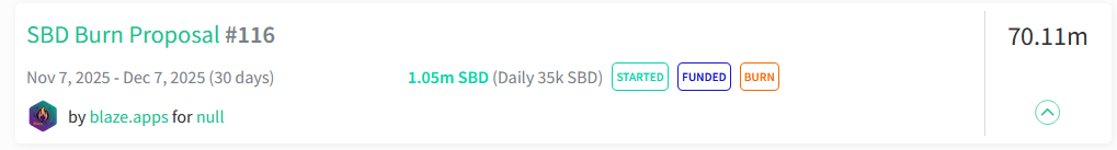 The burn has now commenced. The first hourly batch of 1,456 SBD (equivalent to 35,000 SBD per day) has been successfully sent to the @null address — permanently removing it from circulation.