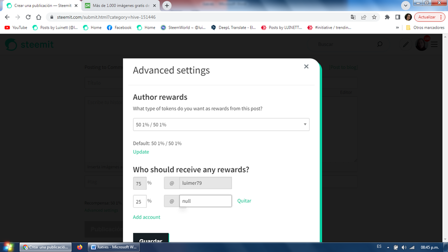Consiste en el envio de cierta cantidad de nuestras recompensas a la cuenta establecida como benefactor de la publicación @null 25% con el fin de fomentar el valor del steem. Aunado a este proceso en cada publicación realizada en steemit debemos emplear la etiqueta #burnsteem25 con el fin de tener opción a un mayor apoyo de las cuentas
