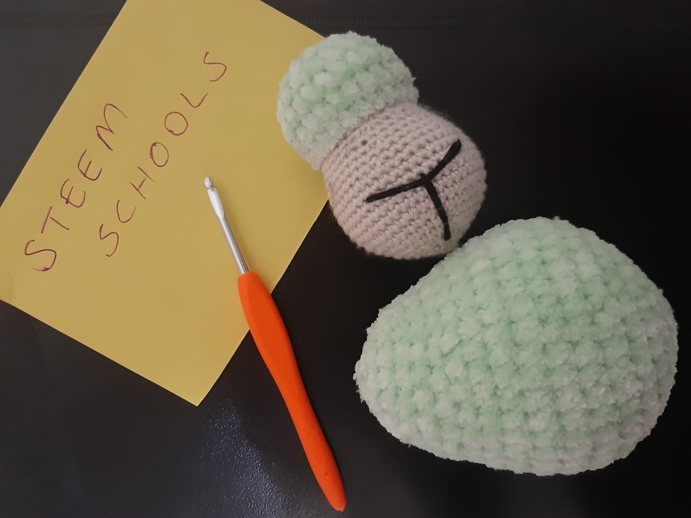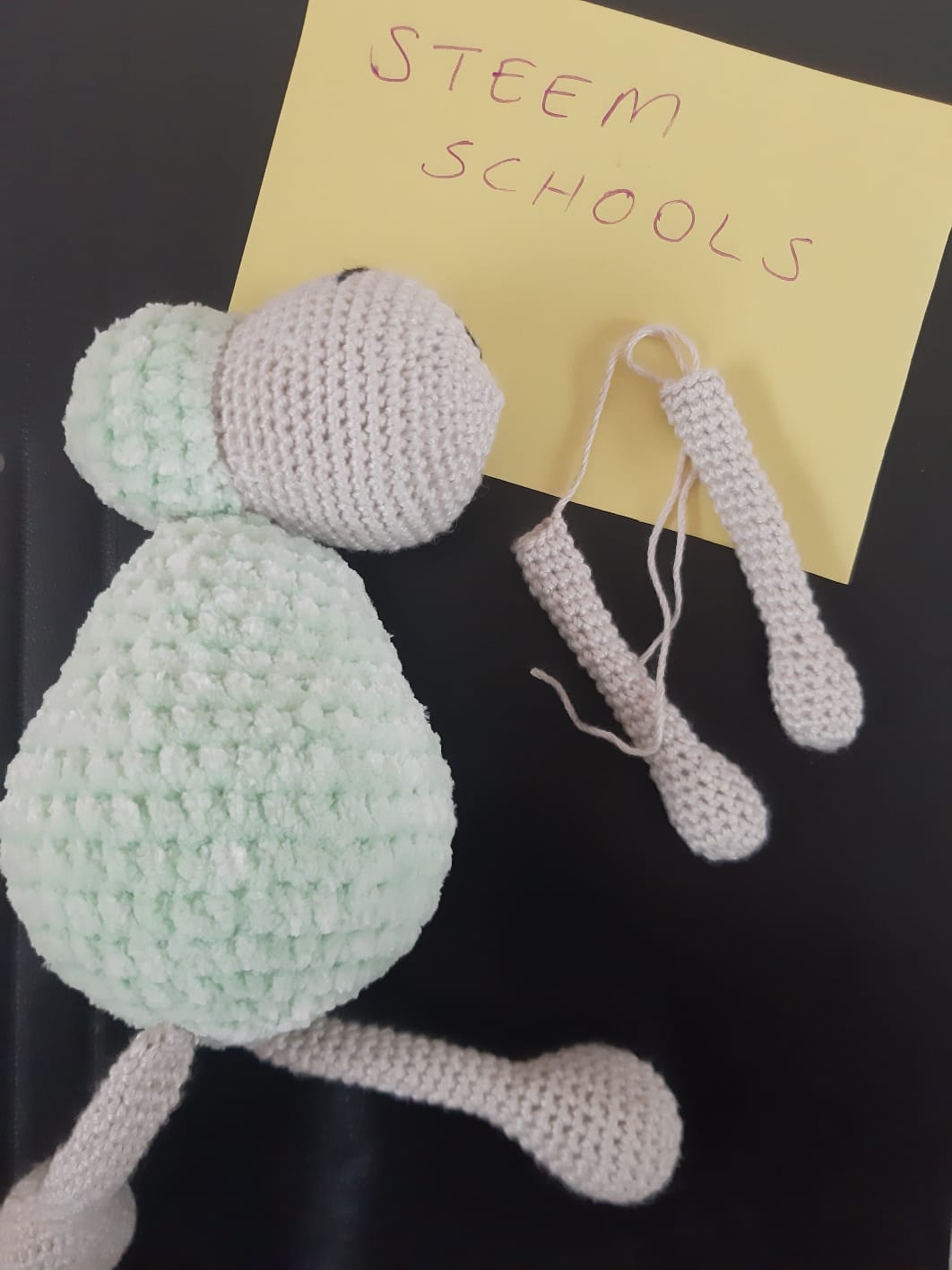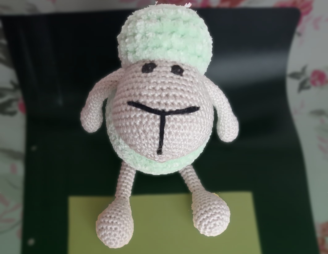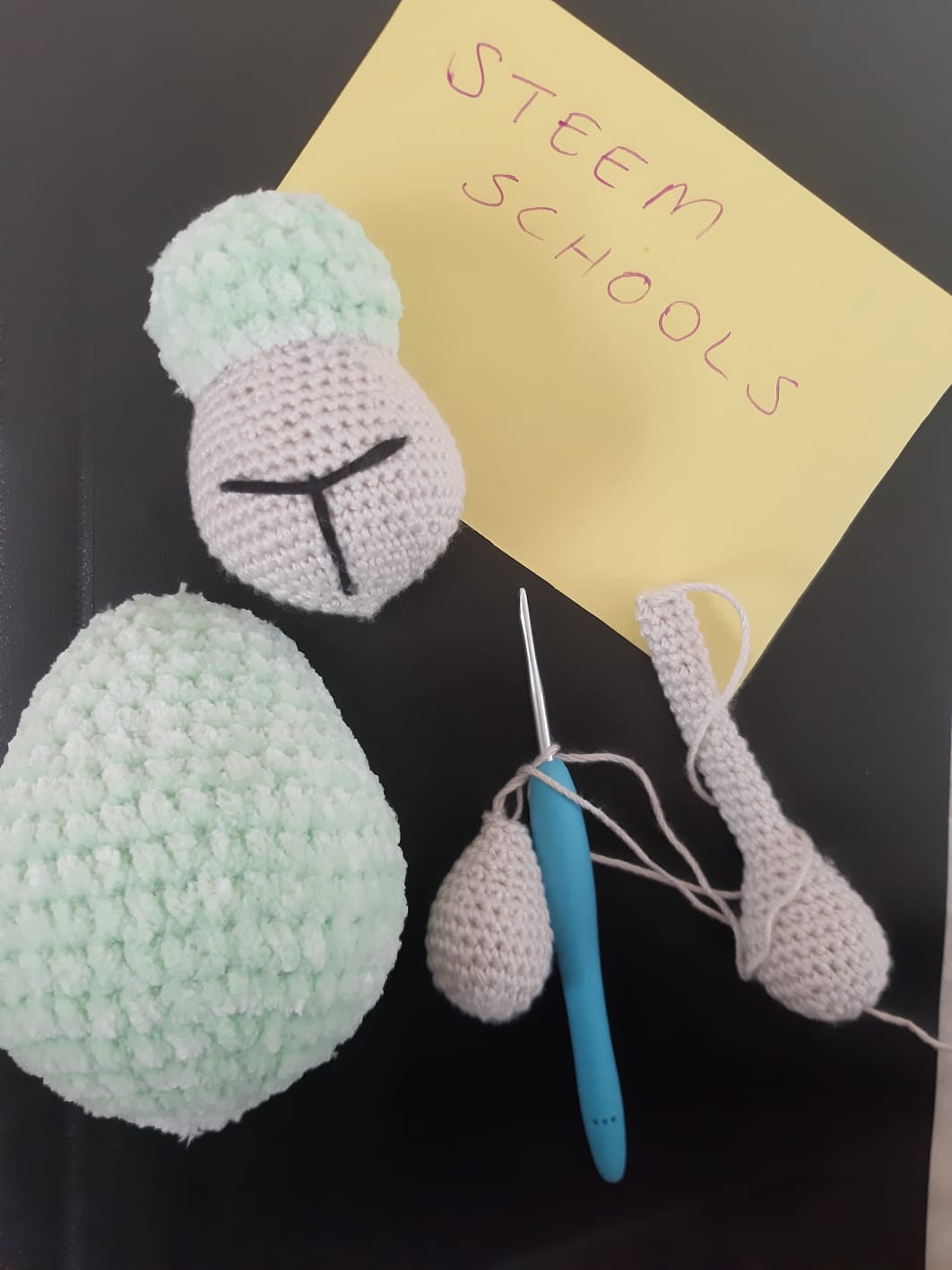 I started knitting the sheep’s legs with my blue crochet hook. You can see the completed parts and the parts being knitted together in the following image.
