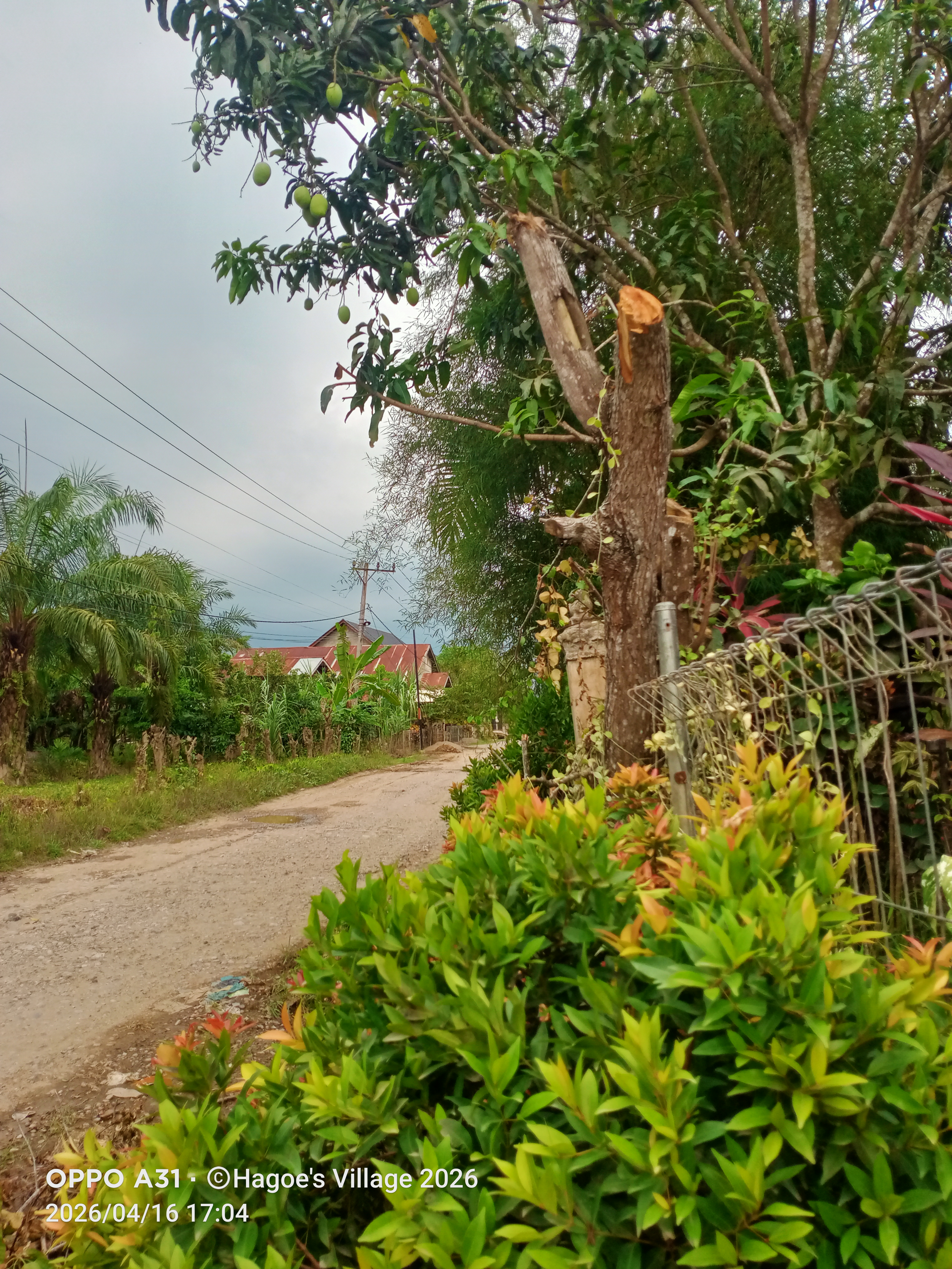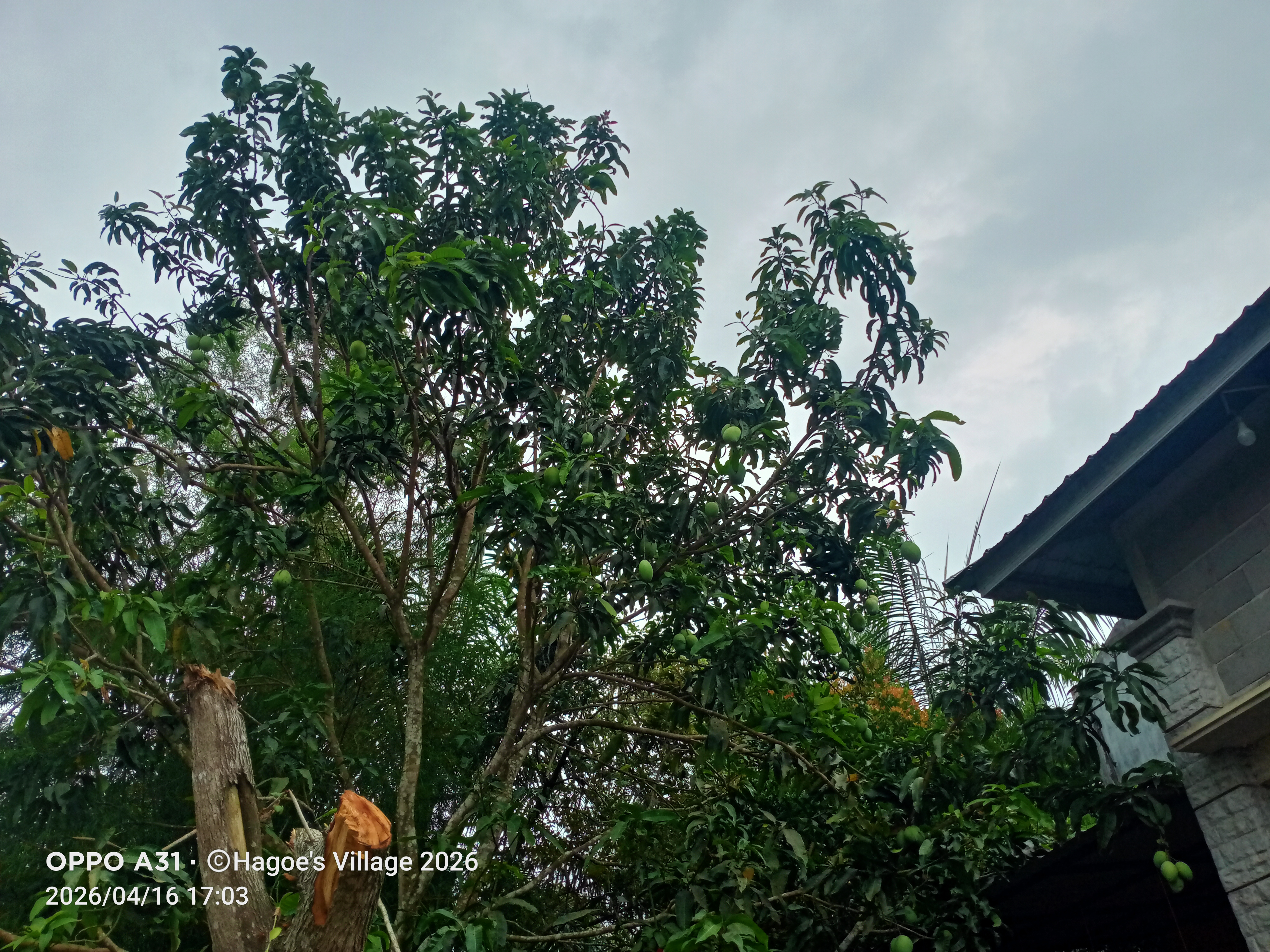 Aku harus mengejar waktu untuk memetik buah mangga yang ada di halaman rumah kami ini agar tidak keburu hujan, mengingat cuaca sudah terlihat sangat mendung.