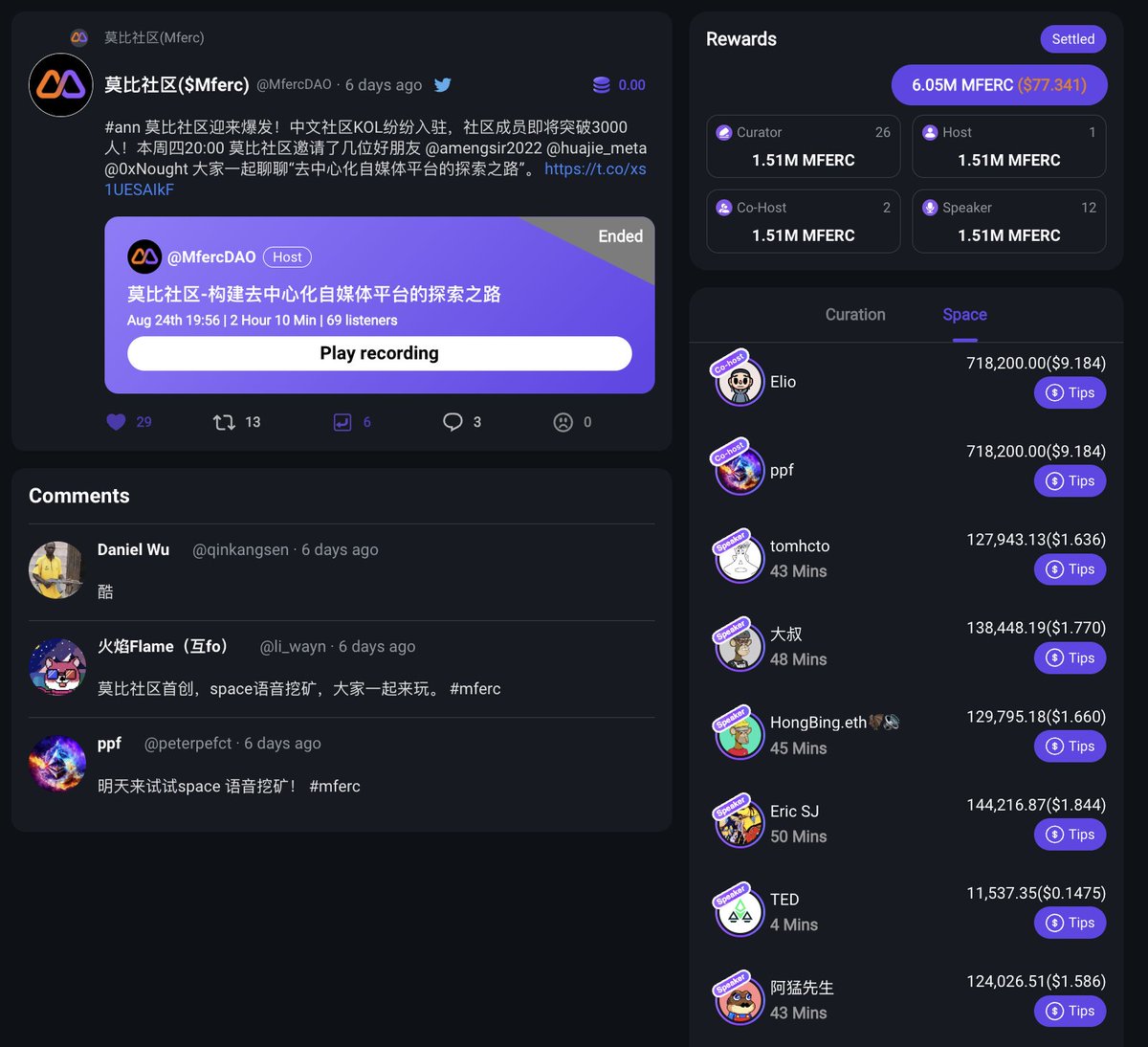 依托于生态伙伴@wormhole_3 强大的技术支持mfercdao (58)in wormhole3 • 2 years ago 依托于生态伙伴@wormhole_3 强大的技术支持, 莫比社区开启了twitter space语音挖矿的尝试,上周四的space所有参与人共计获得了$77.34的收益! #mferc