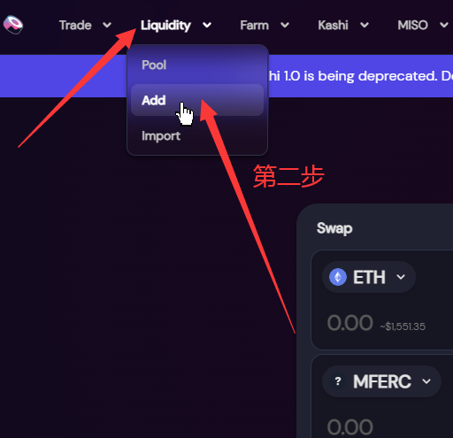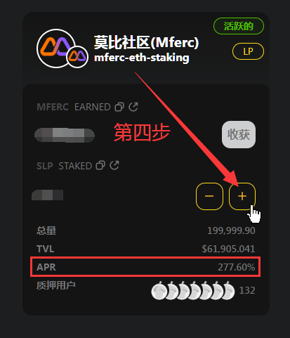 今天讲下如何在莫比社区质押获得年化277%收益,如图点社区—莫比社区—兑换进sushi平台,点Liquidity—Add添加ETH-MFERC LP,回莫比社区点质押,选mferc-eth矿池,点+将刚才组好的LP添加进去即可开始挖矿,以后点击收获即可提取收益,Mferc合约 0xb4ee30de6bf7e8f9efbfcc9715021144defde96f