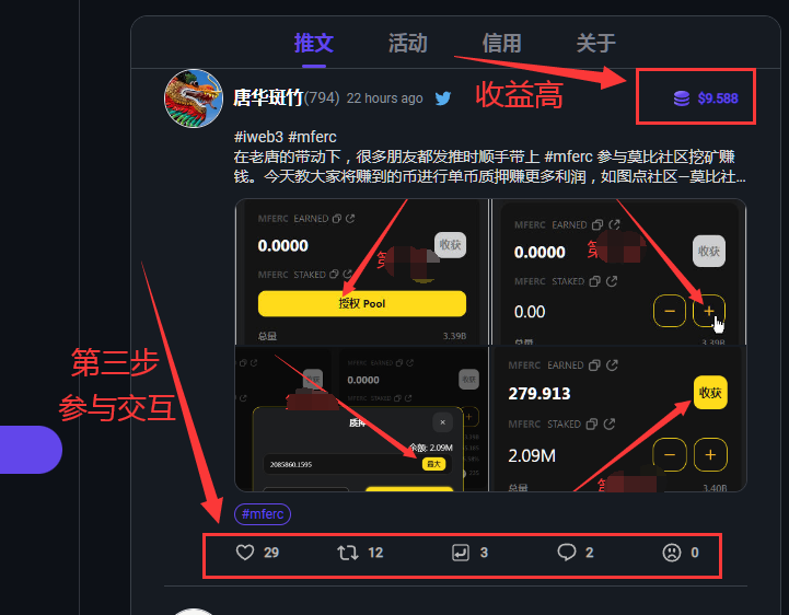 大V可以发推带 #mferc 参与莫比社区挖矿,那么没有流量的小白怎么在莫比挖矿赚钱呢?其实很简单,就是积极参与交互,点赞转发评论越多收入越高