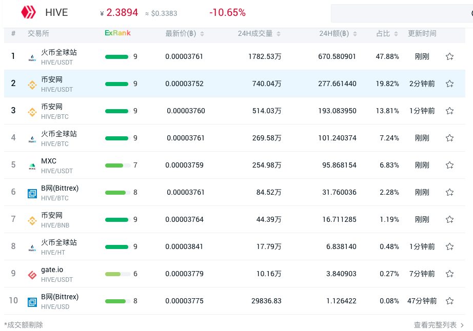 从HIVE交易量市场分布,看HIVE分叉最受益交易所