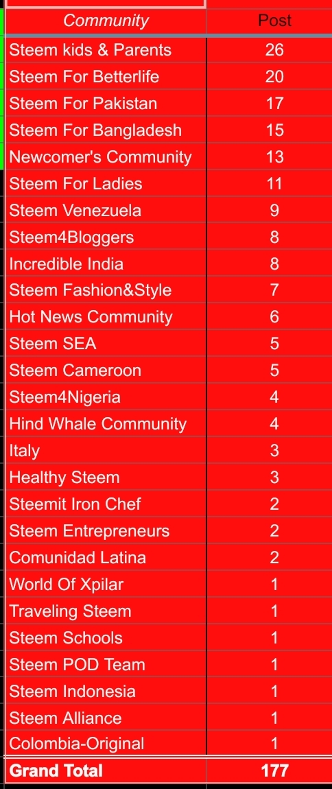 We found them in 27 different communities, Steemkids/parents were leading with 26 Posts, followed by Steem4betterlife with 20 posts, and Steem Pakistan was the third with 17 Posts accordingly.