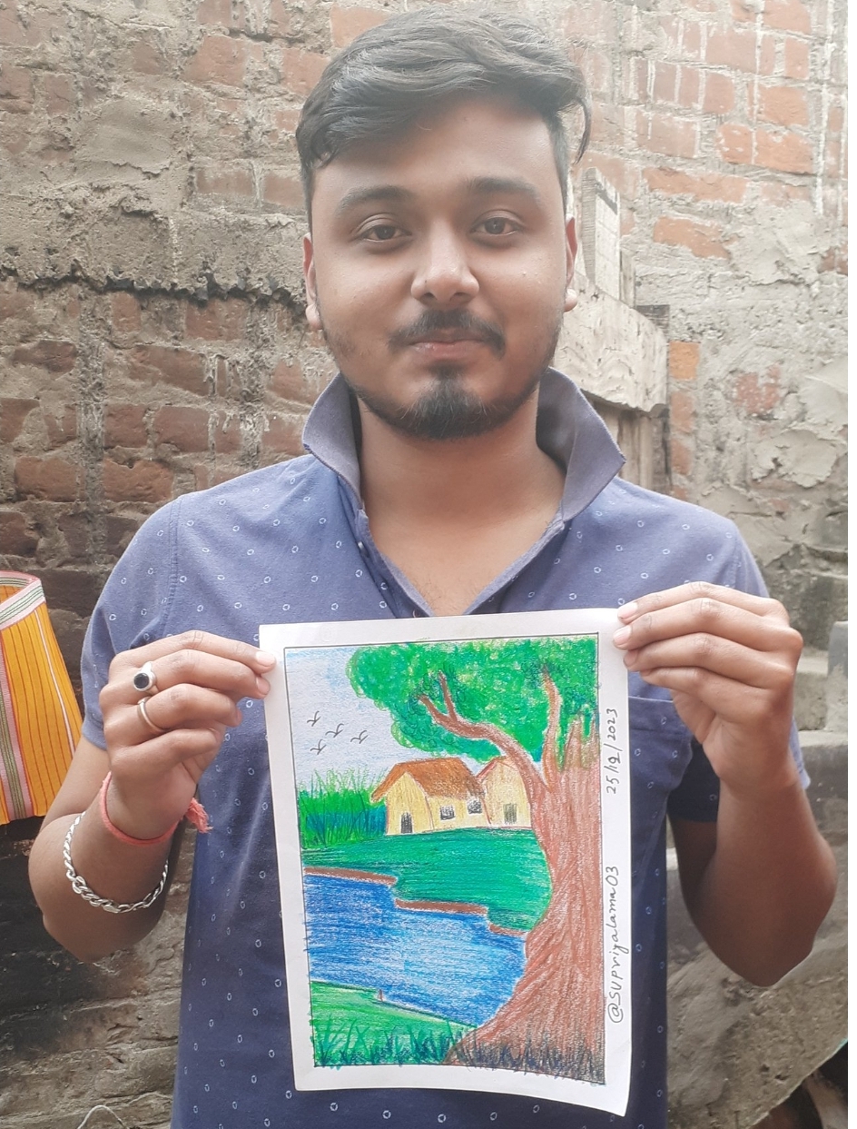 It was a beautiful art post by @supriyalama03 he drew a very beautiful village scenery and a home beside a blue stream. He showed us steps by step of the drawing and I hope he'll be encouraged by Goodybest 5 days