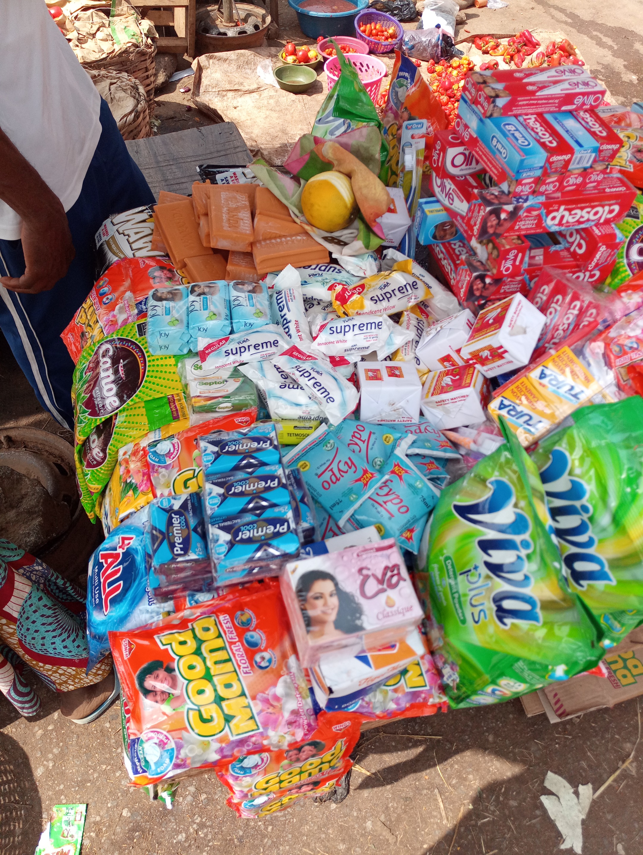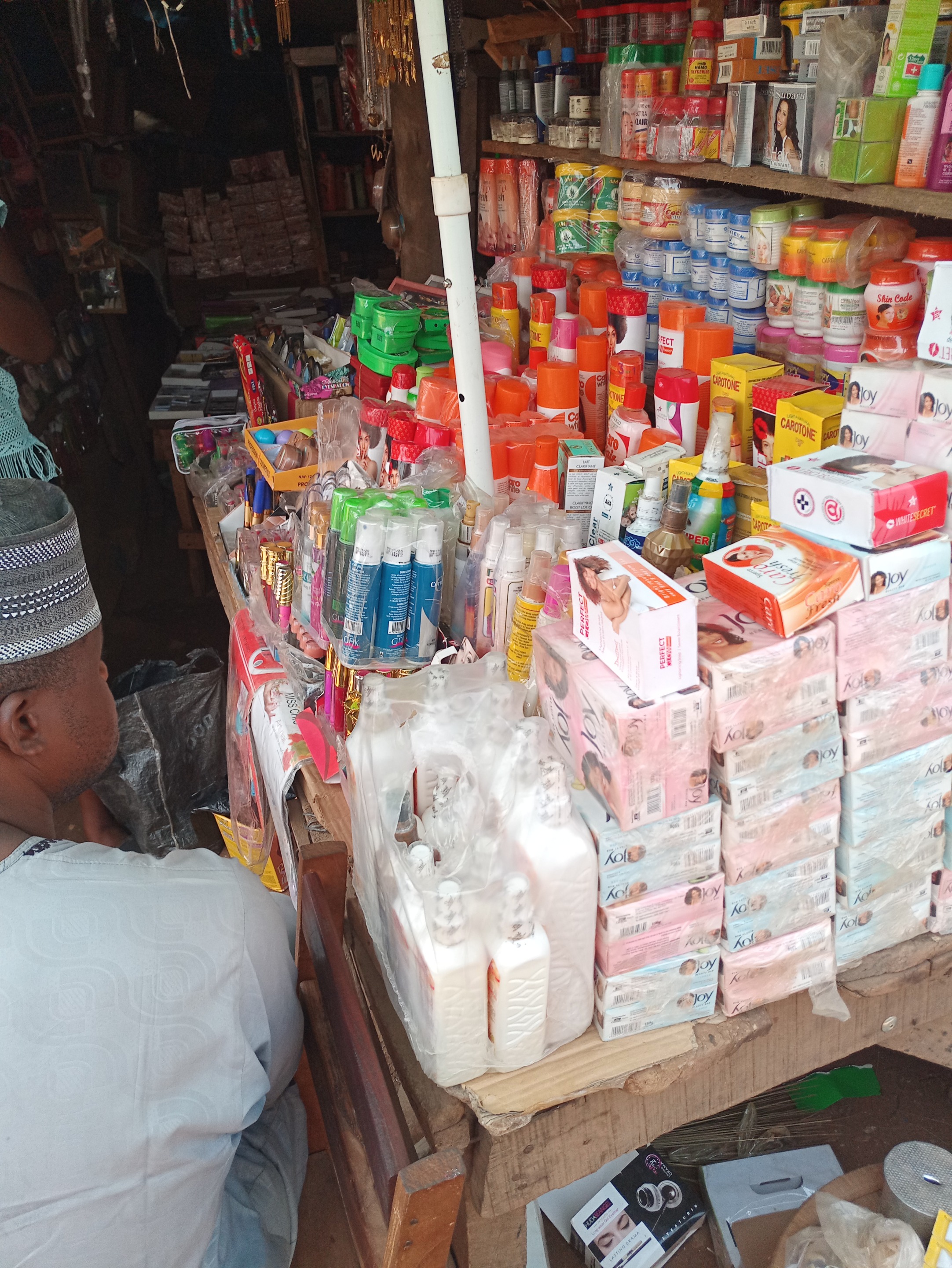 This is a view of a man selling detergents or soap and other creams also