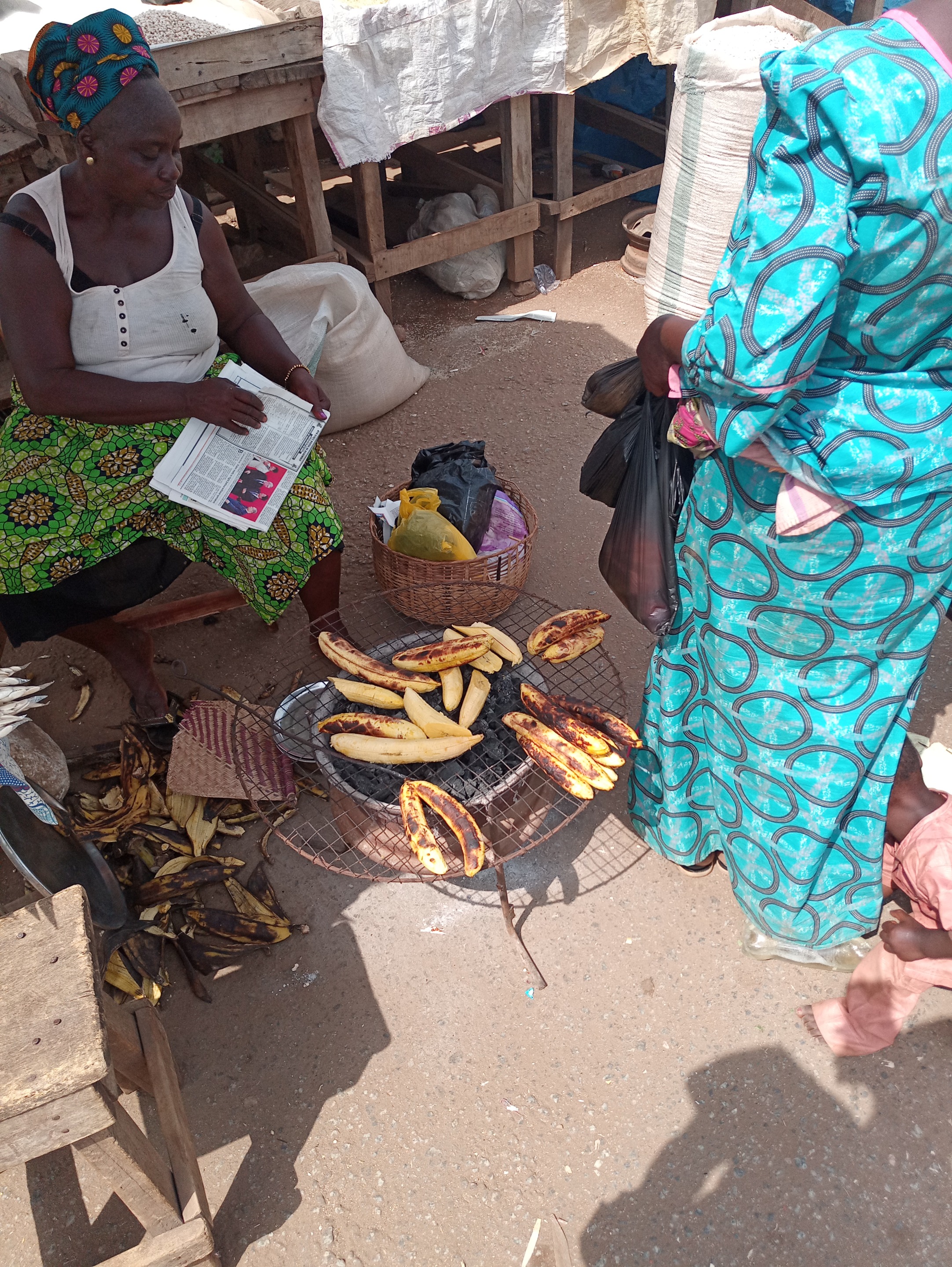 This is a view of a woman roasting plantain by the roadside for sale and as you can see somebody is buying from her when I took this picture