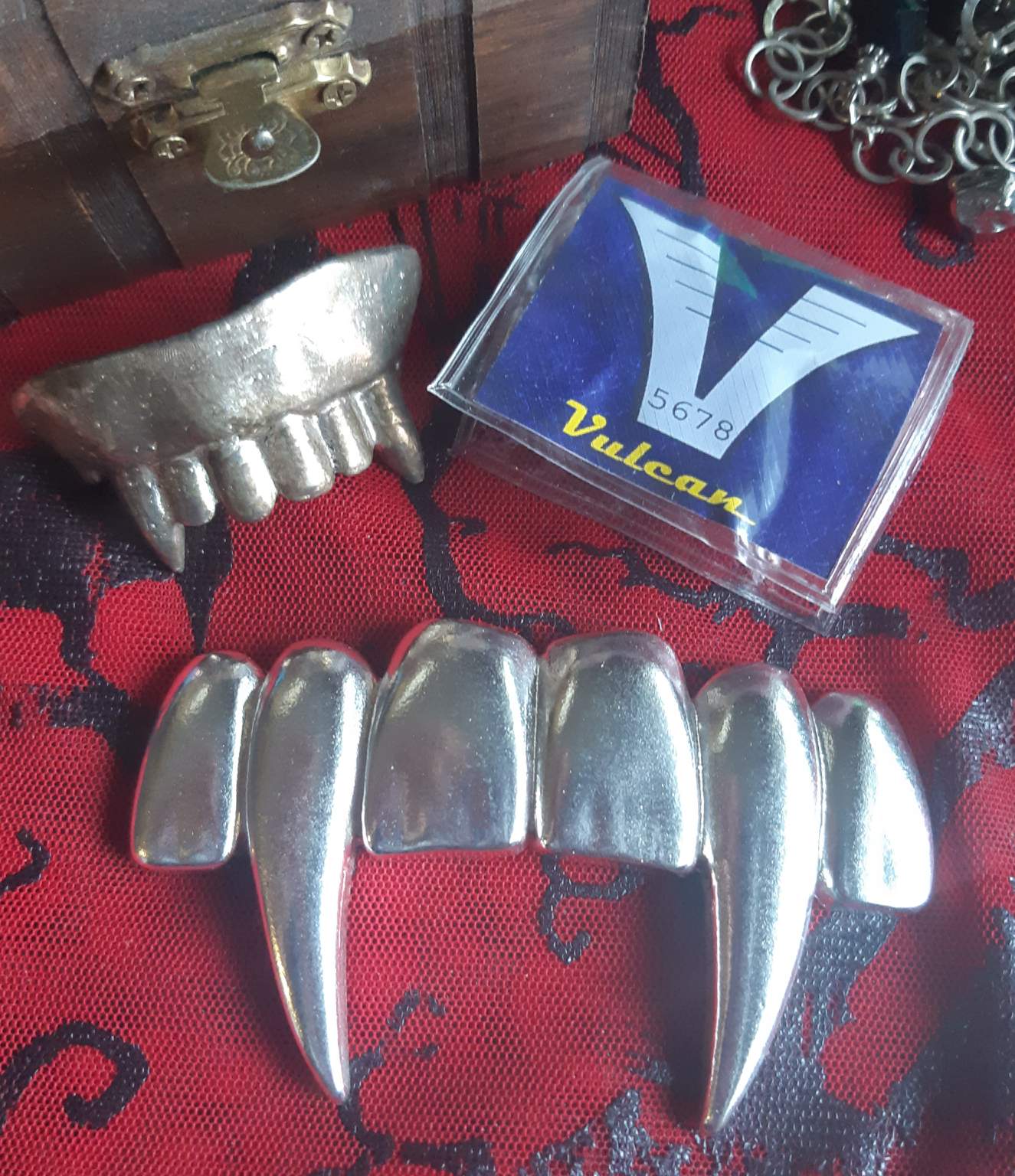For a comparison in size next to my older original fangs. They are HUGE, so they don't fit my mouth at all so they're just for show. Much Love Sis, 🌺🤗🌹💝