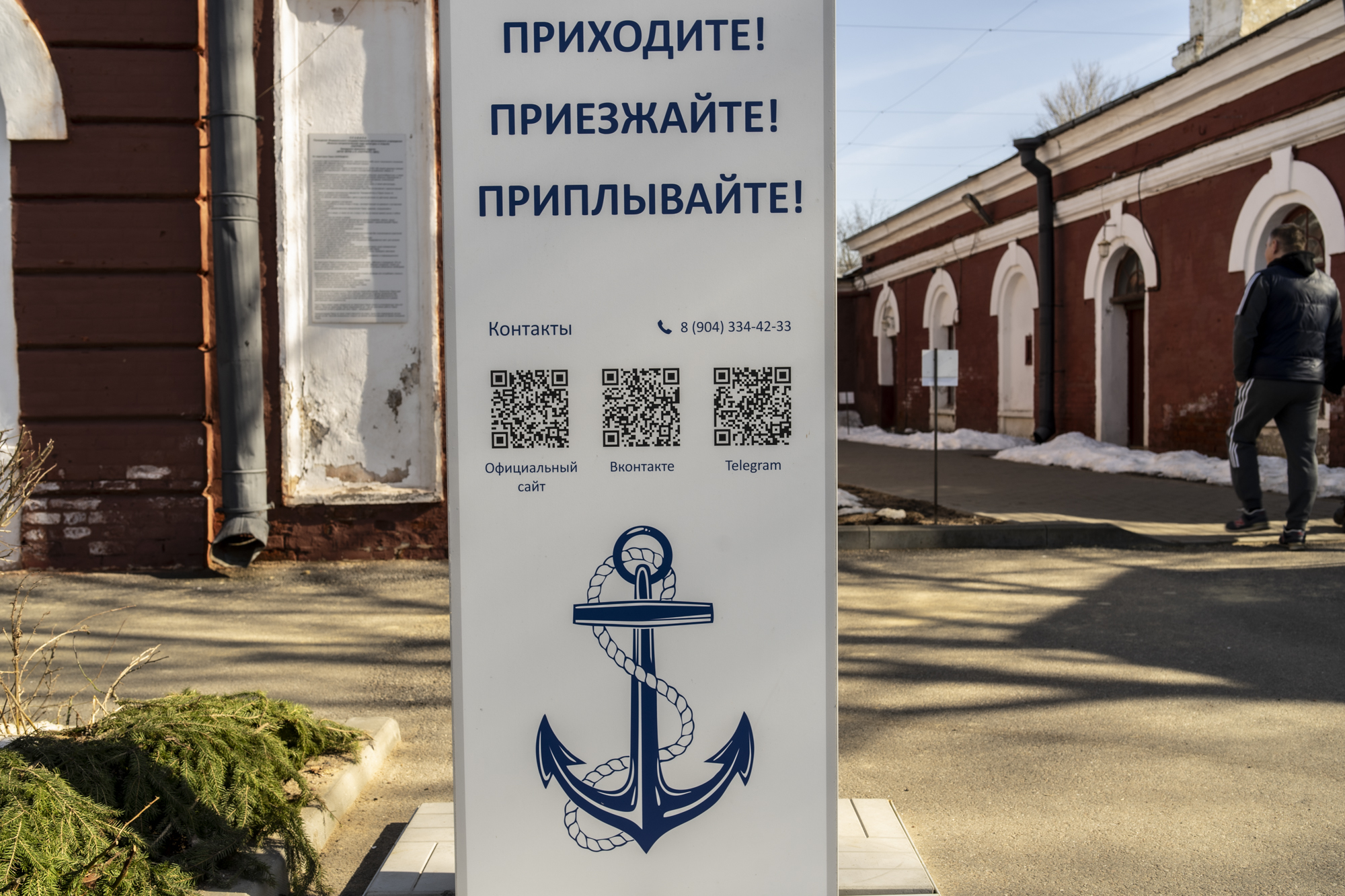 Надпись на доске гласит:"Приходите. Приезжайте. Приплывайте". Отсканировав QR-коды вы сможете получить дополнительную официальную информацию.