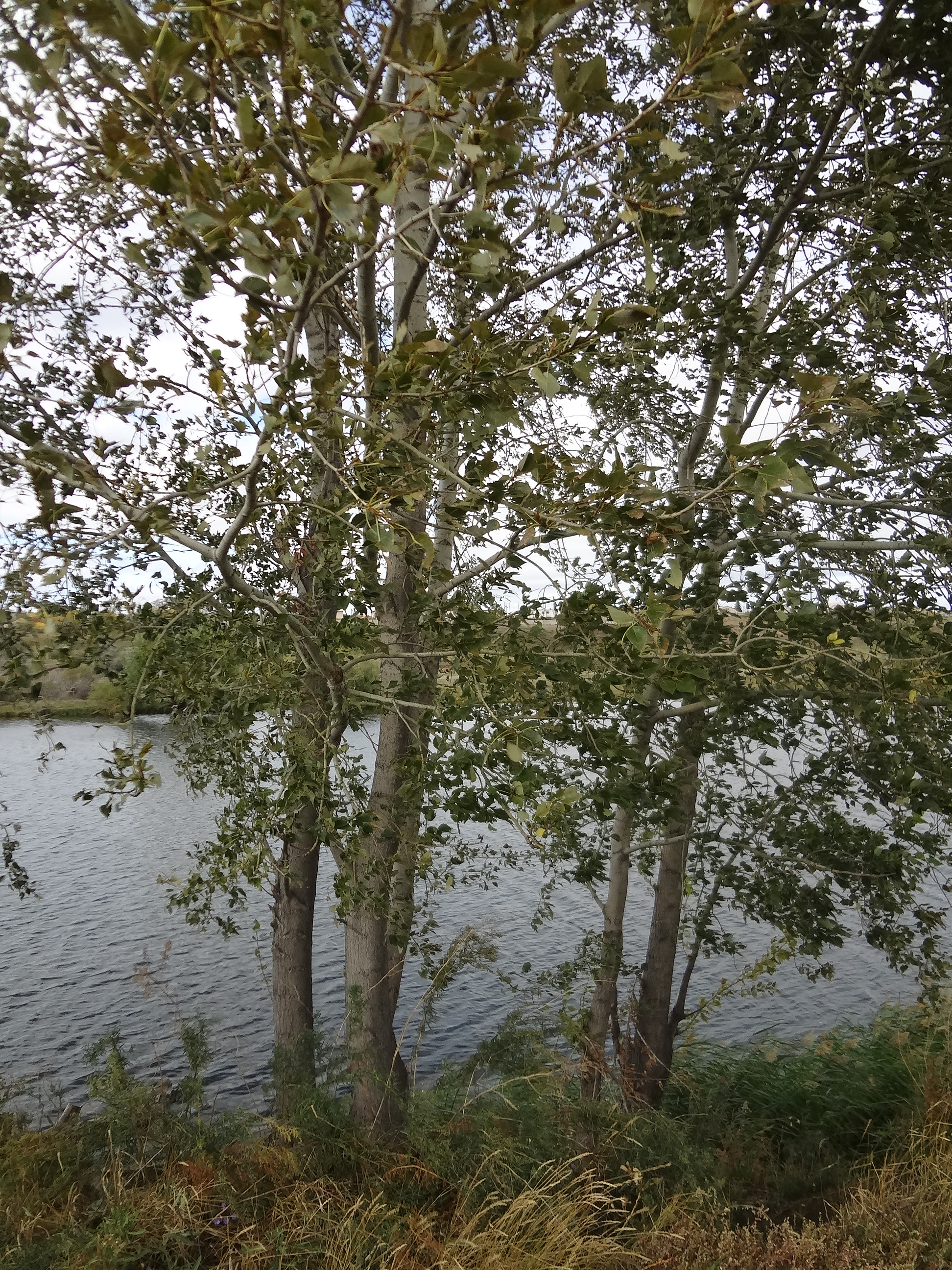 View of the river water through large trees.