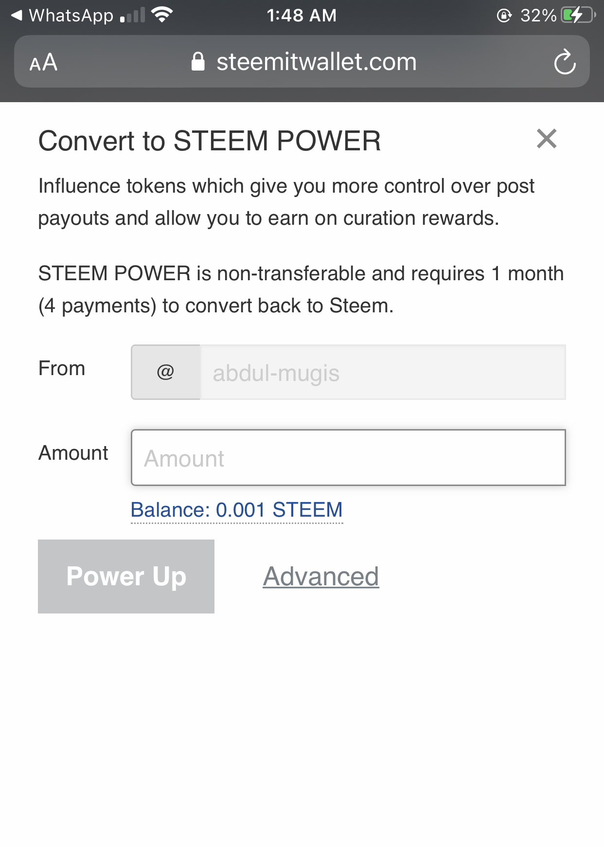 The amount you want to power up will be demanded by the nest pop out box; you will see how much current steem you have in your wallet below; please enter the amount you want to power up.