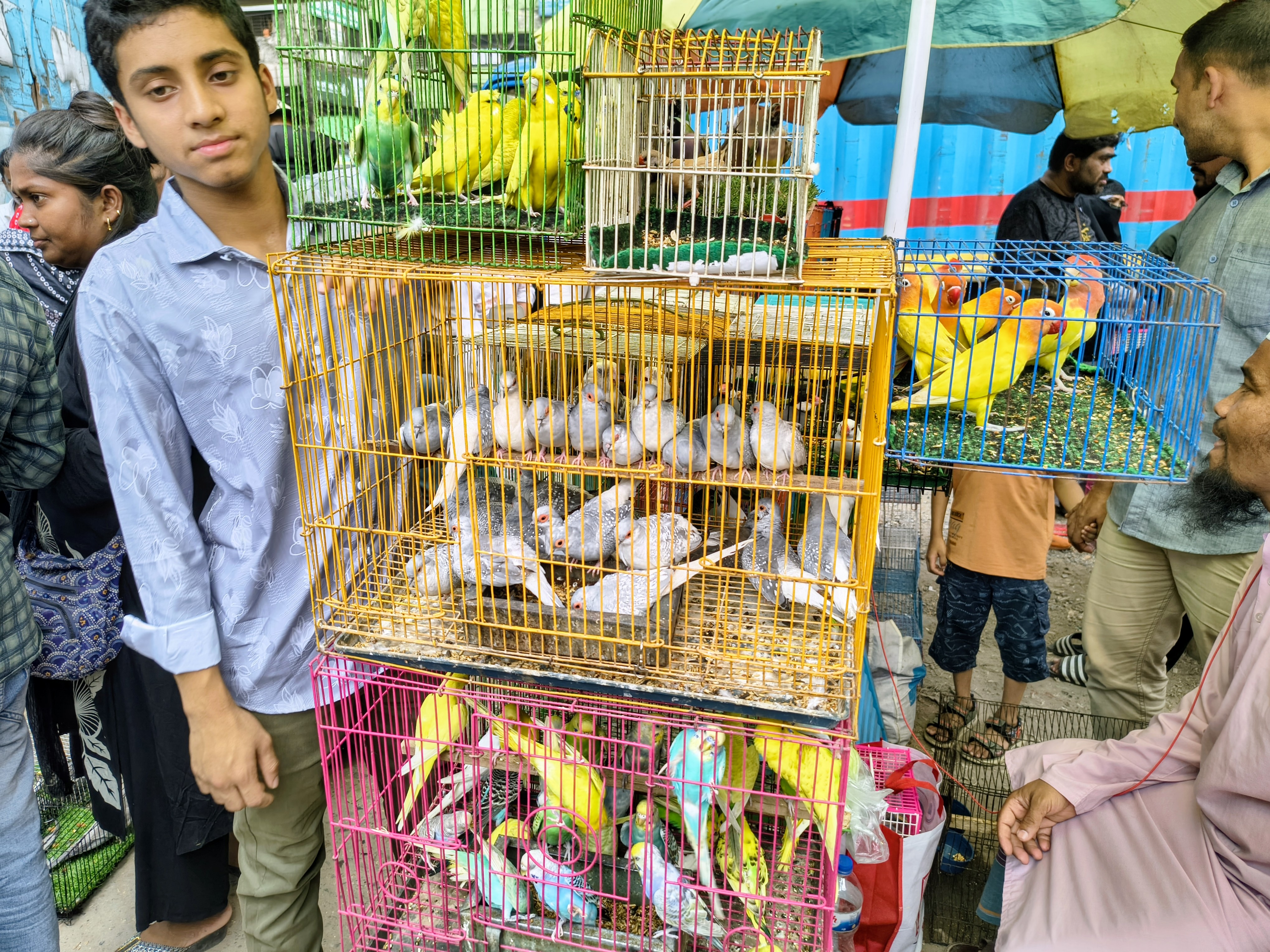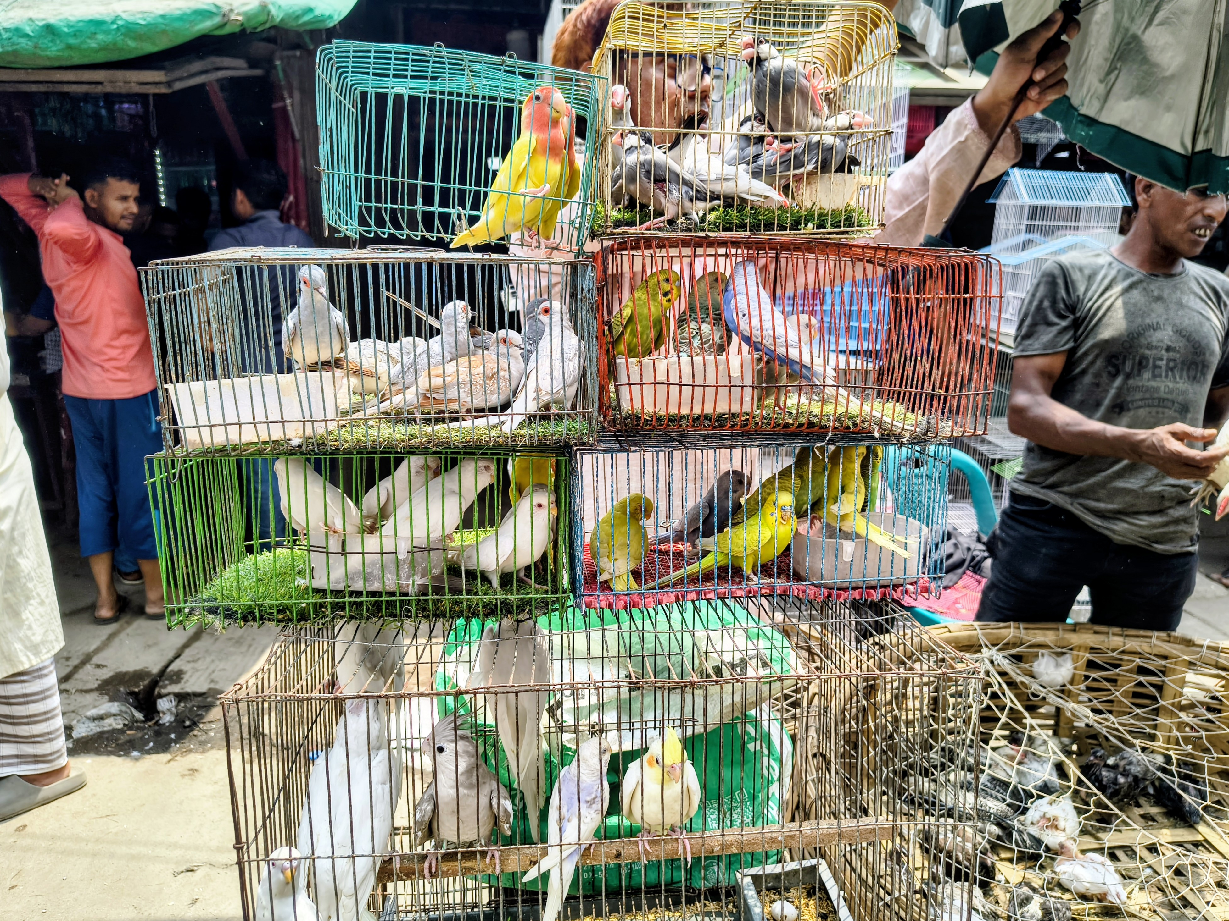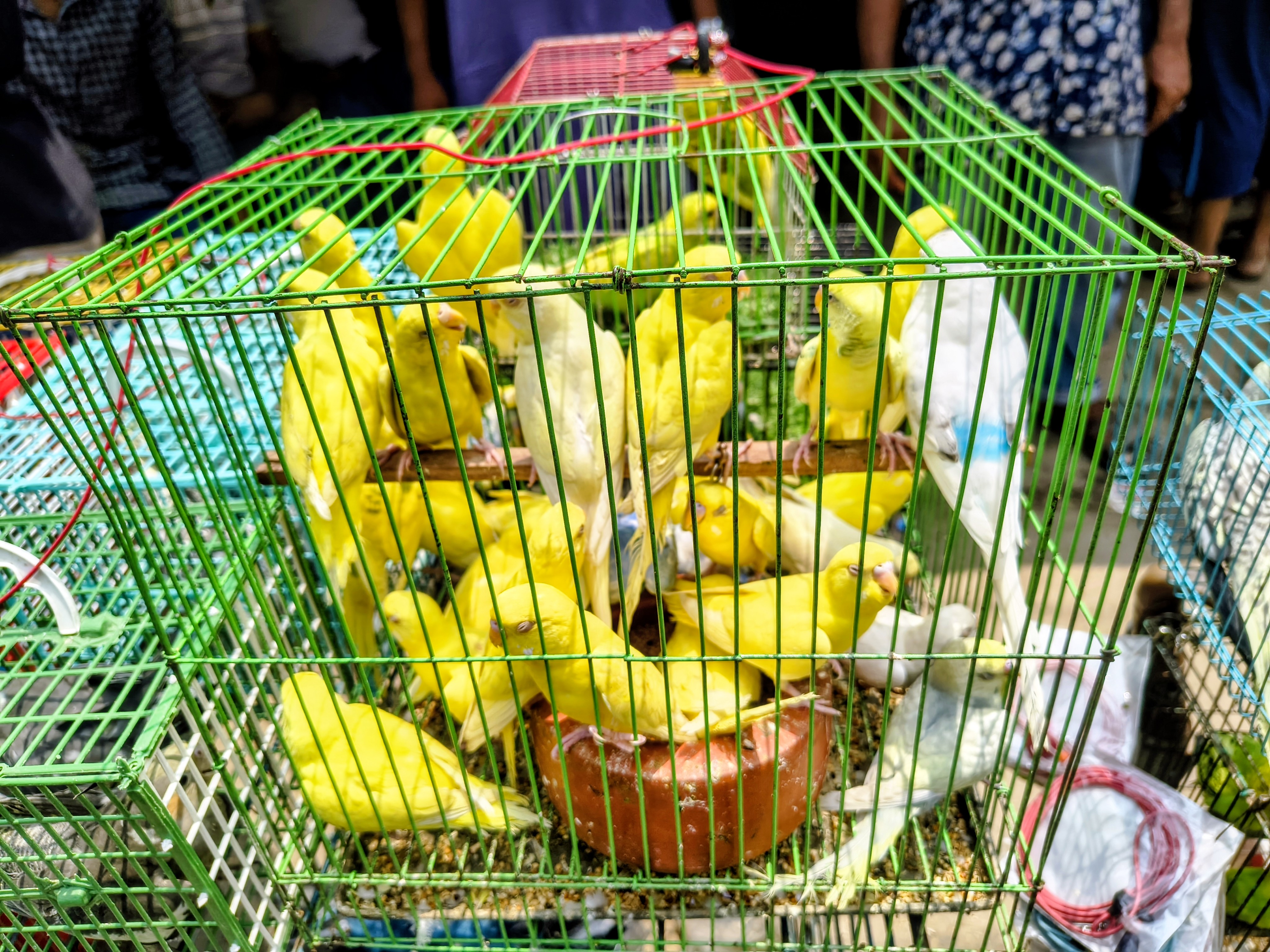 The other cages in the middle are white finches and green-yellow budgerigars. Finches are very small in size and are always fidgety. On the other hand, budgies are the best-selling birds in the market due to their beautiful color variety and ease of handling.