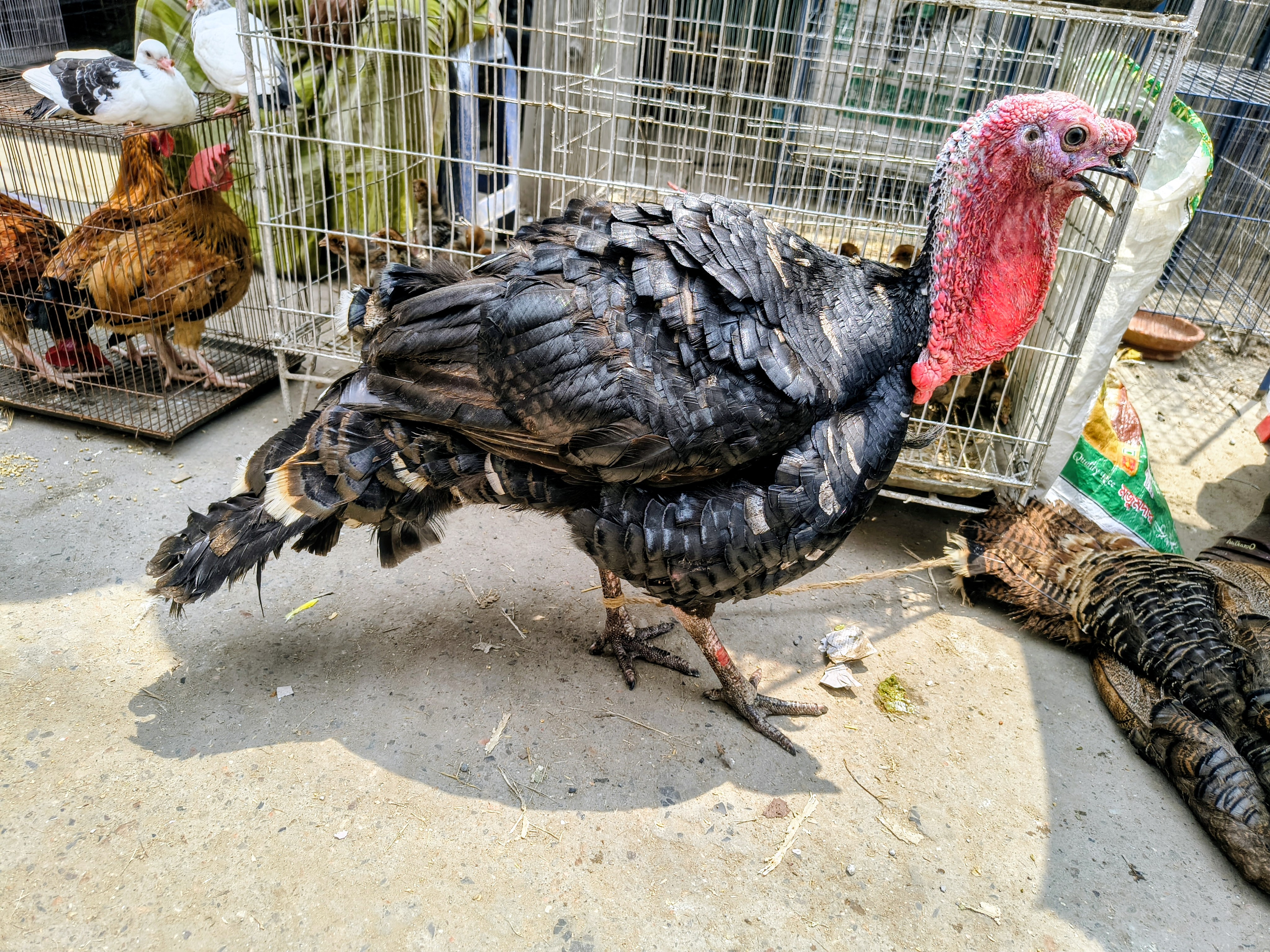 The large black and gray bird is the turkey. Their body structure is quite large and the neck part is reddish in color. Turkey is currently quite popular in Bangladesh for meat. Food lovers who come to the market especially look for large and healthy turkeys. In addition, there is a high demand for local chicken and there is even a large amount in the market.