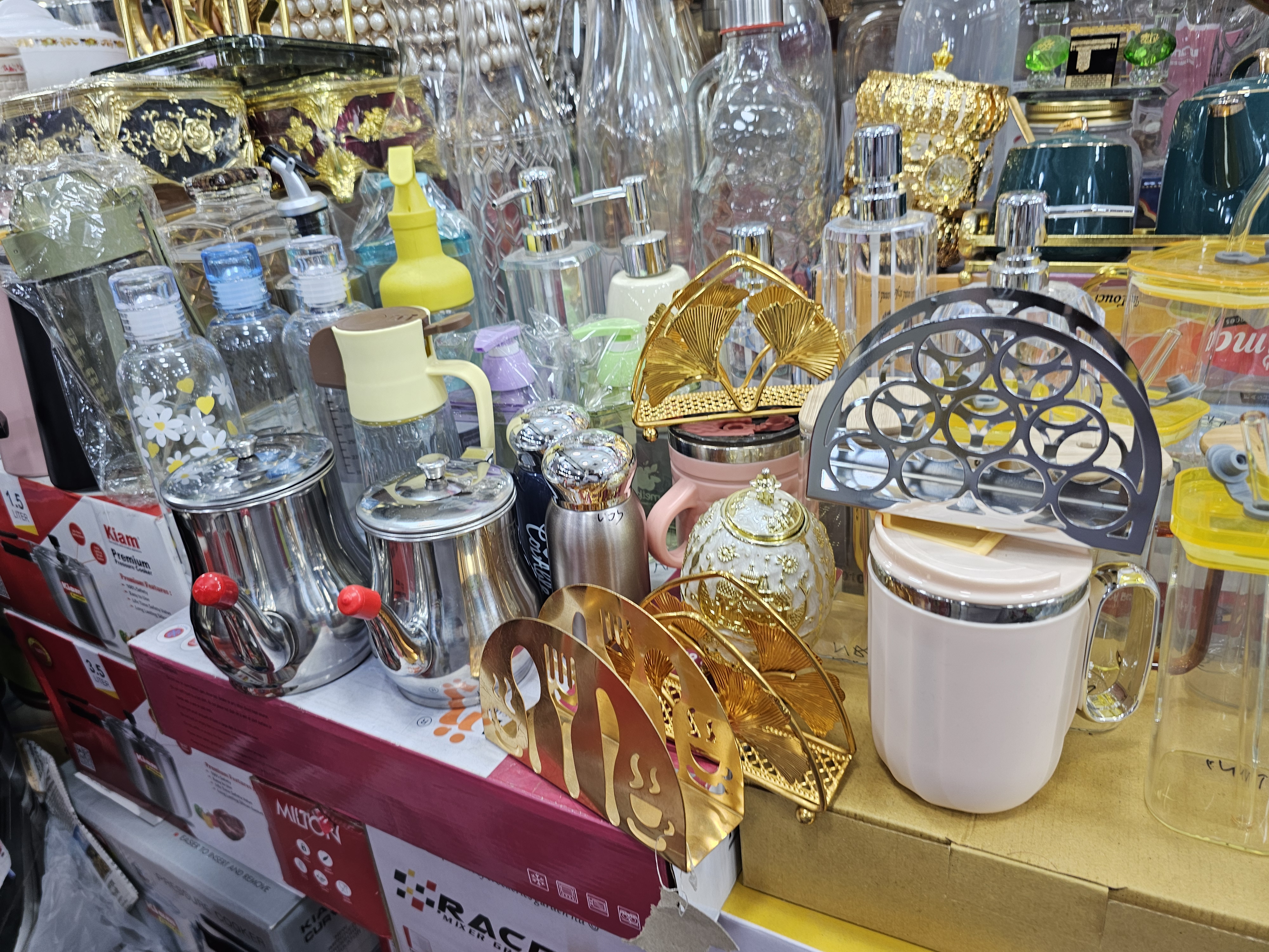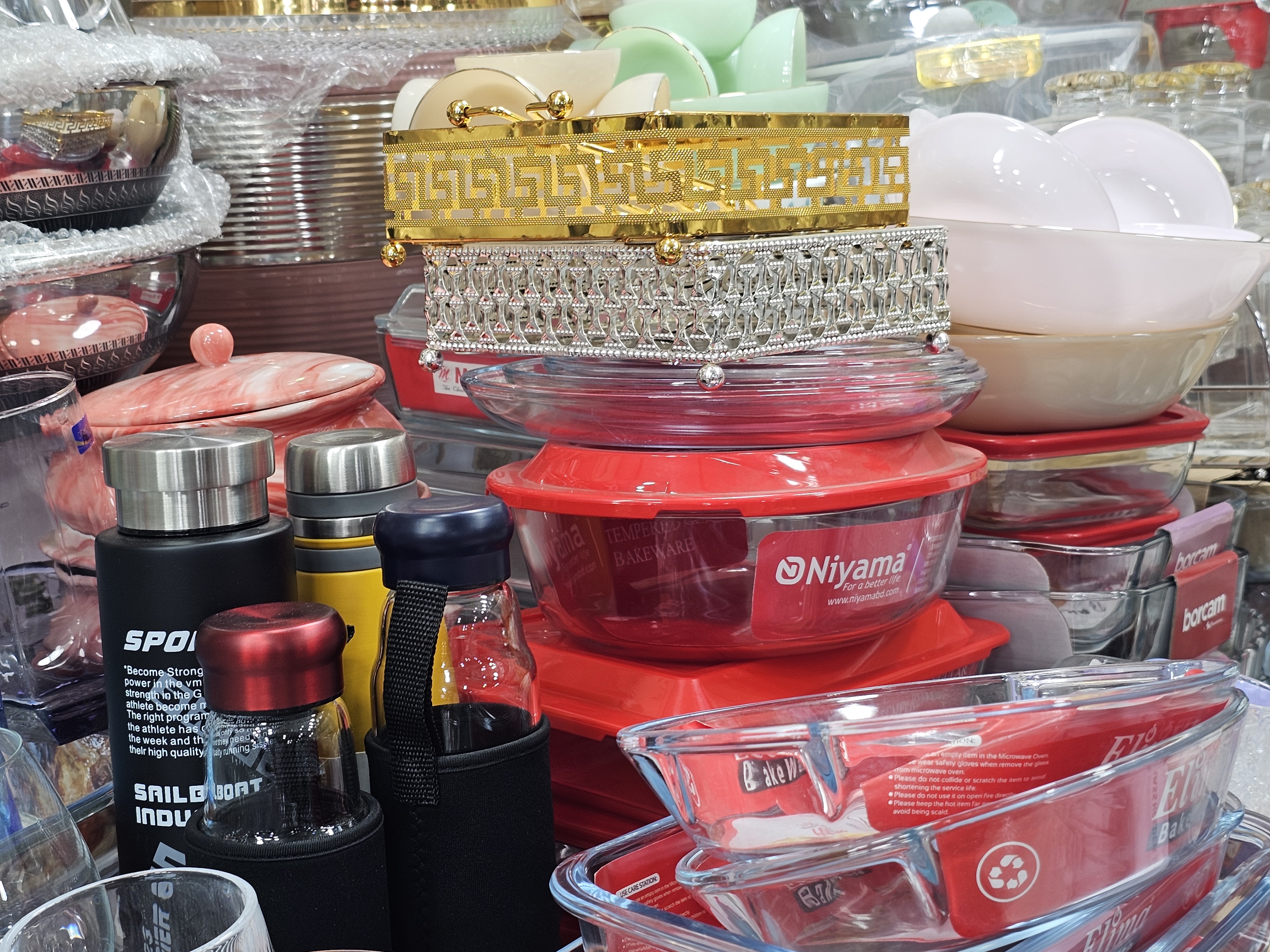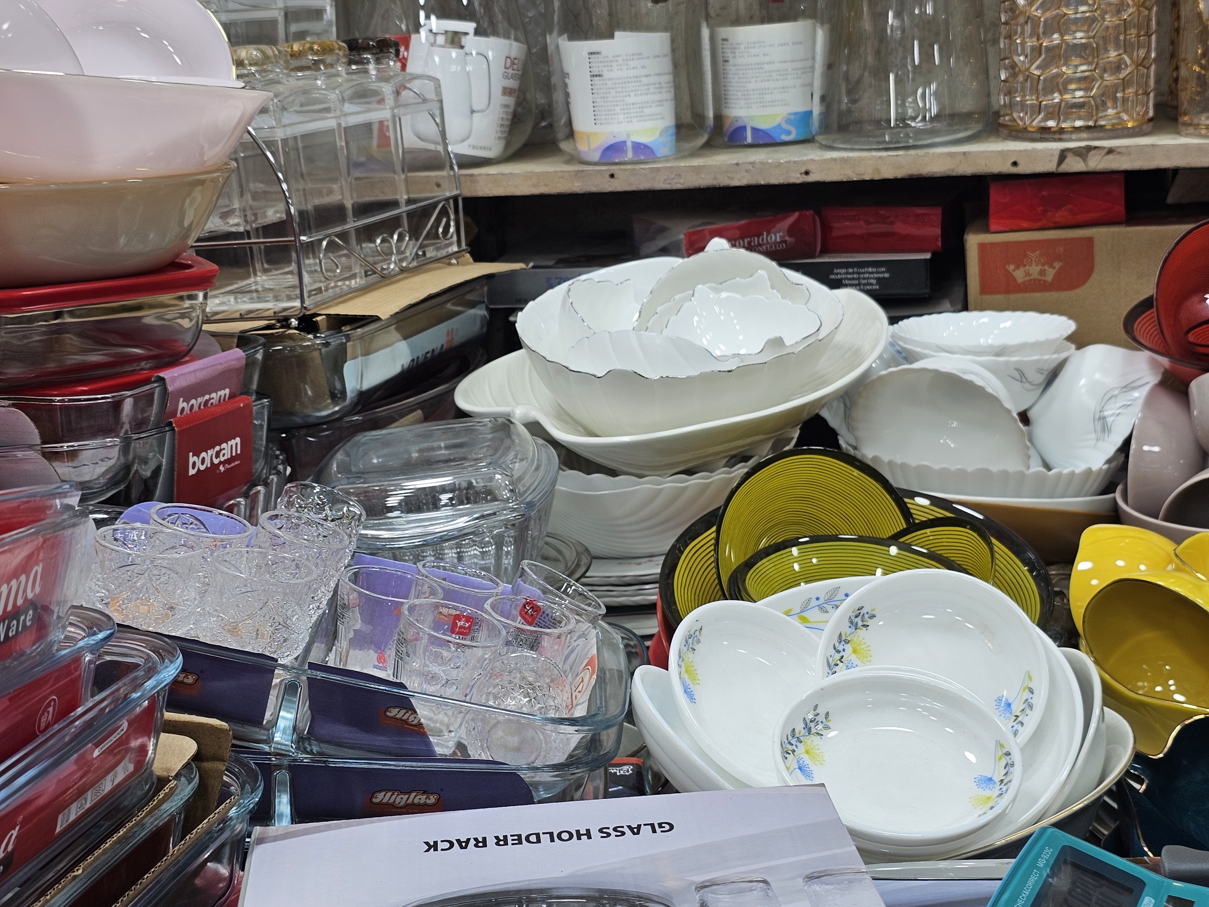 This shop has all the crockery items. There are dinner sets, bowls, glasses, glass stands, various small and large pots, pans, ovens, rice cookers, all kinds of household items. Every item is very important for all of us at home. Especially everything from cooking to eating is available here. That is, the ones we use to cook food and the ones we use for eating. There are even tissue stands, glass stands, and spoon stands to keep on the table. In other words, all the items are available in this one shop.