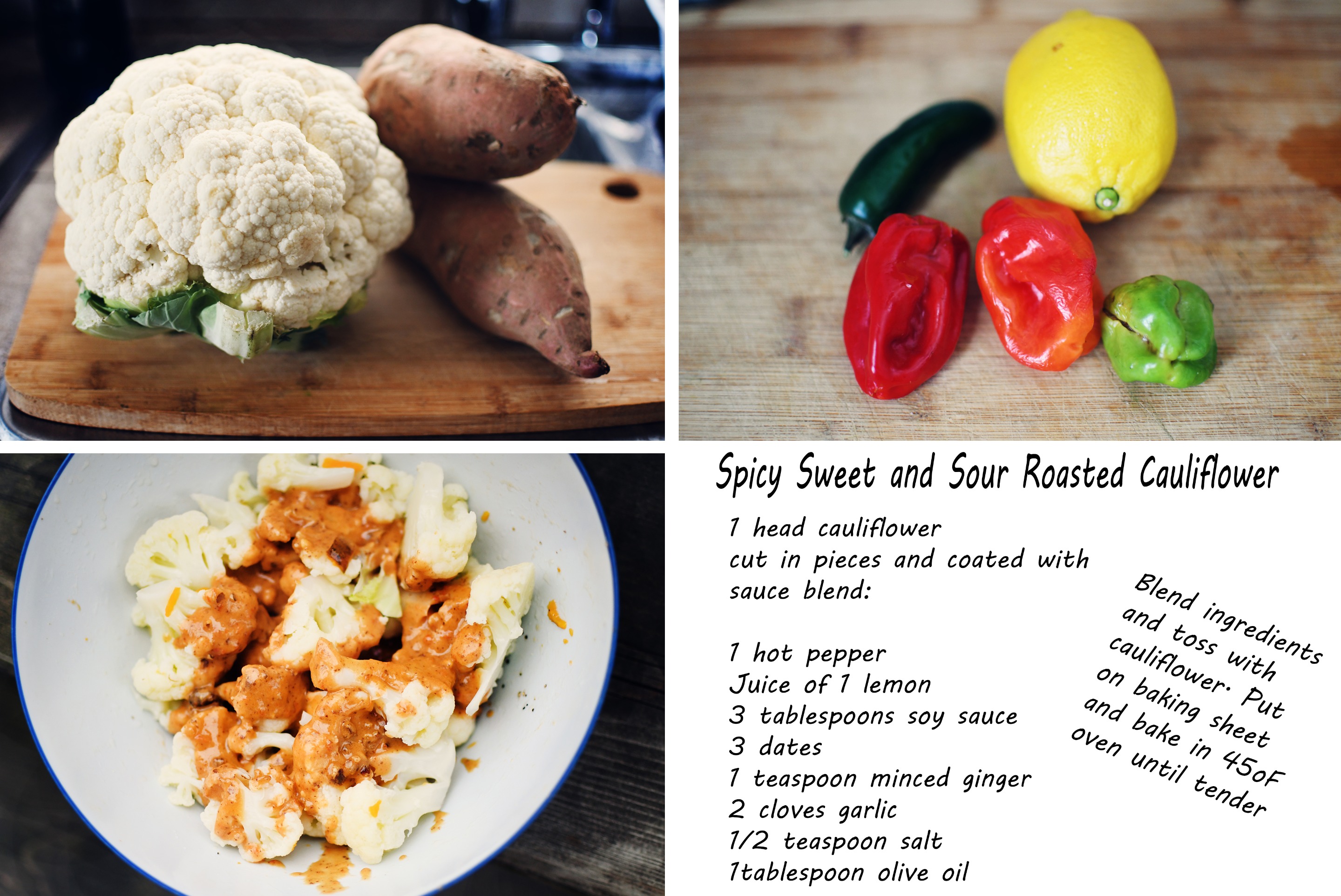 I wanted to spice up the cauliflower with a sweet and spicy sauce so I before the cauliflower went in the oven they were tossed with the sauce and bake until the moisture was evaporated and the cauliflower was tender.