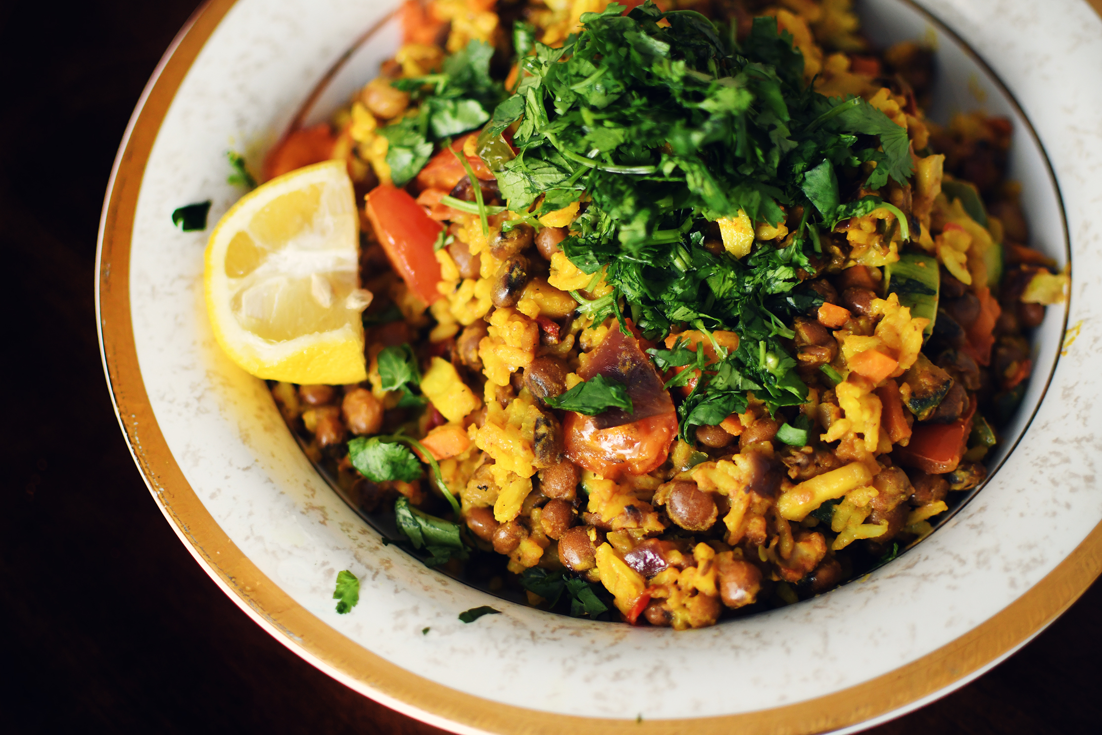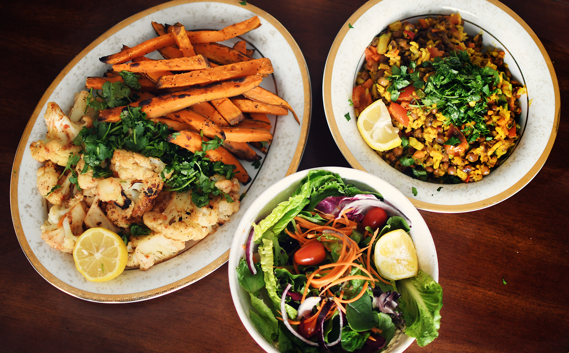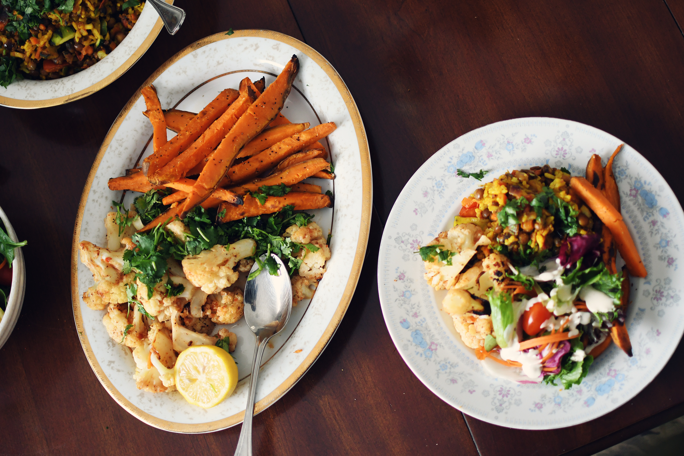 Fruits And Veggies Monday Weekend Feast - Curried Rice And Pigeon Peas, Roasted Sweet Potato Fries And Spicy Sweet And Sour Cauliflower