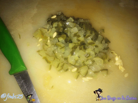 Preparing the gherkin sauce with sweet mustard is extremely easy, for this we will need 150 grams of gherkins cut into cubes, add 1/2 teaspoon of salt, one tablespoon of sugar, one tablespoon of vinegar, and 3 tablespoons of mustard, stir everything to integrate and ready. It tastes delicious and for mustard lovers like me, you will want to put this sauce on everything.