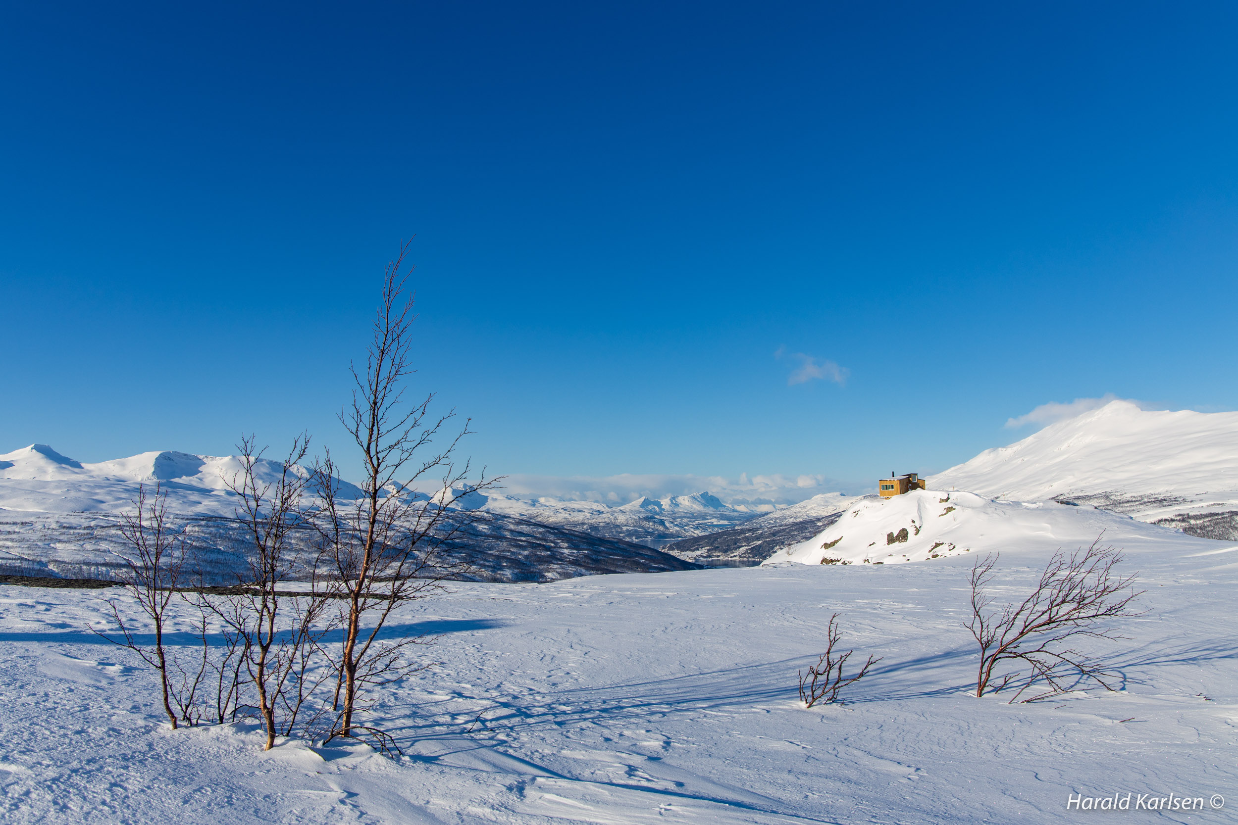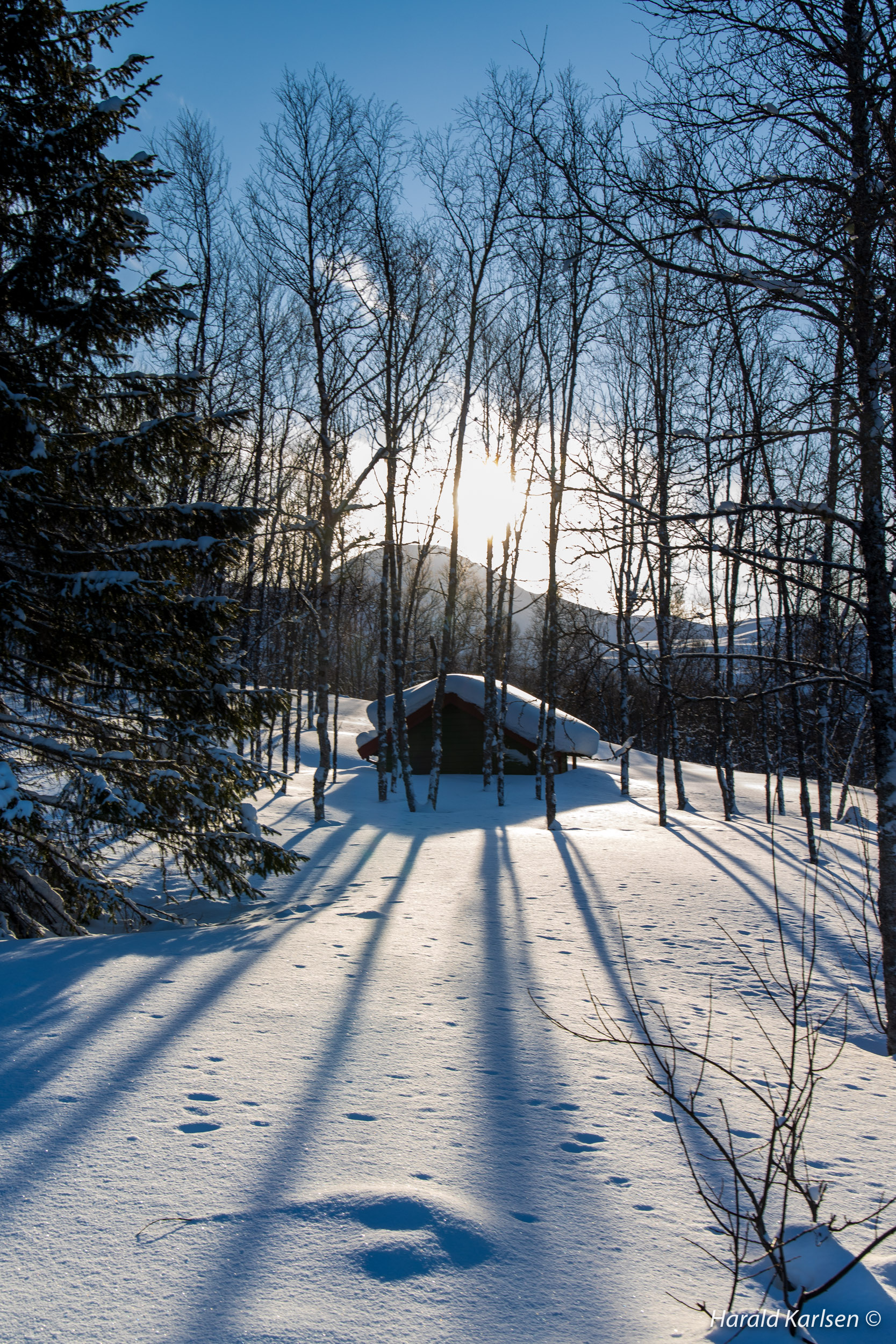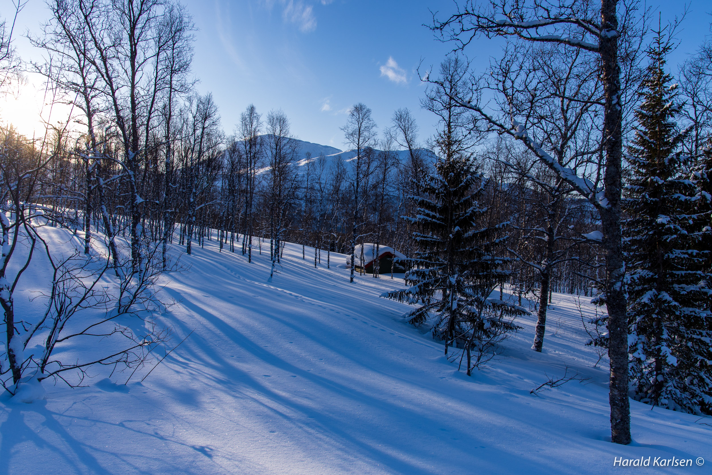 Unfortunately the weather then was very unstable with few days of cold and clear weather. Some clouds is ok though to break up the sky and add life and contrast. Today we had waited long enough, the weather was great, blue sky and minus 14 degrees celsius. So around 9 o'clock we was on our way for todays adventure. We started by the house to the left in the picture. We met one of the persons who had built the cabin and got tips for the best route up the hills.