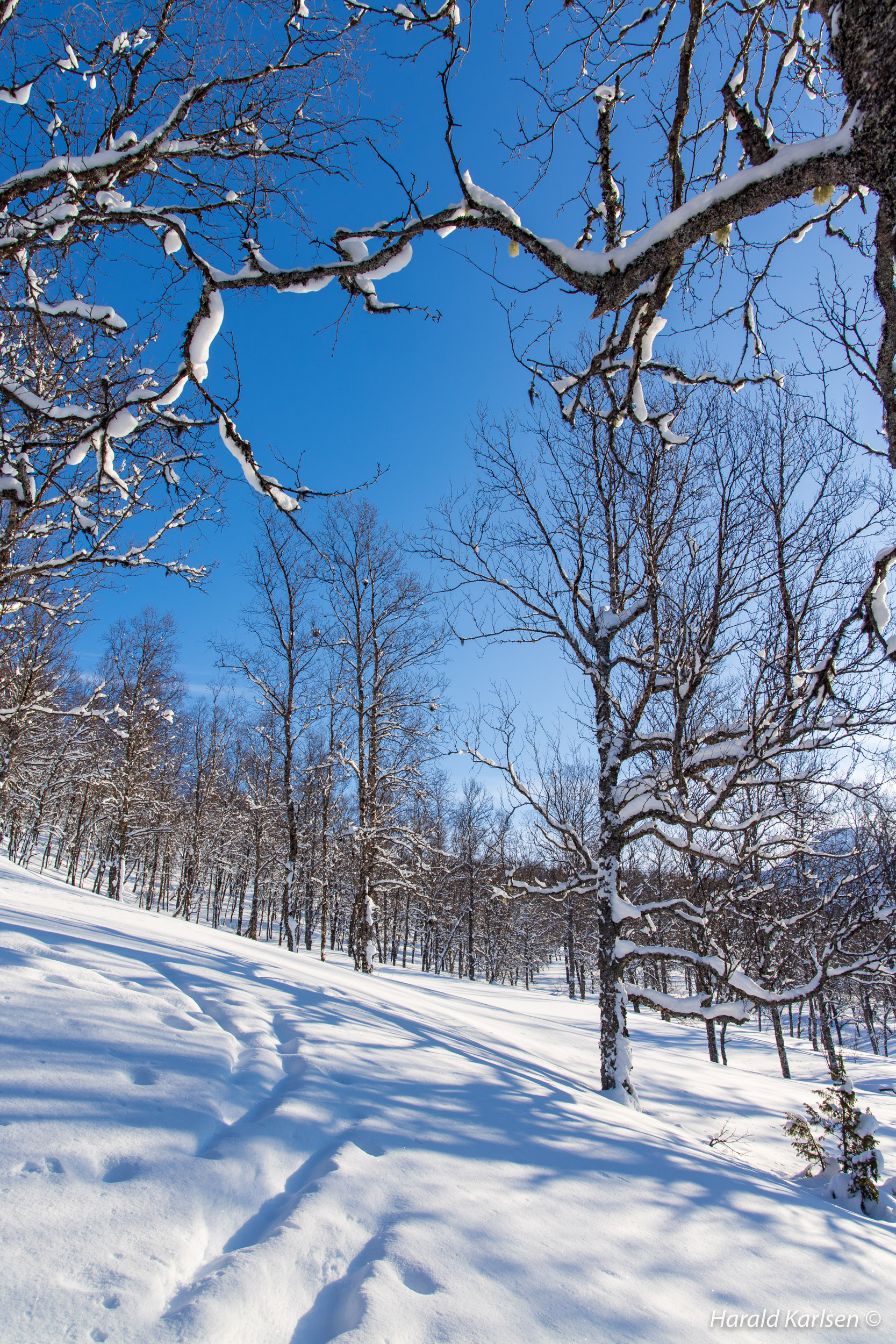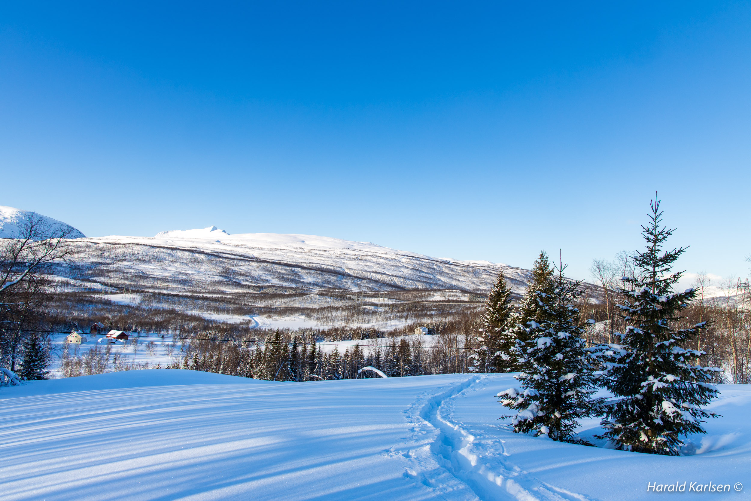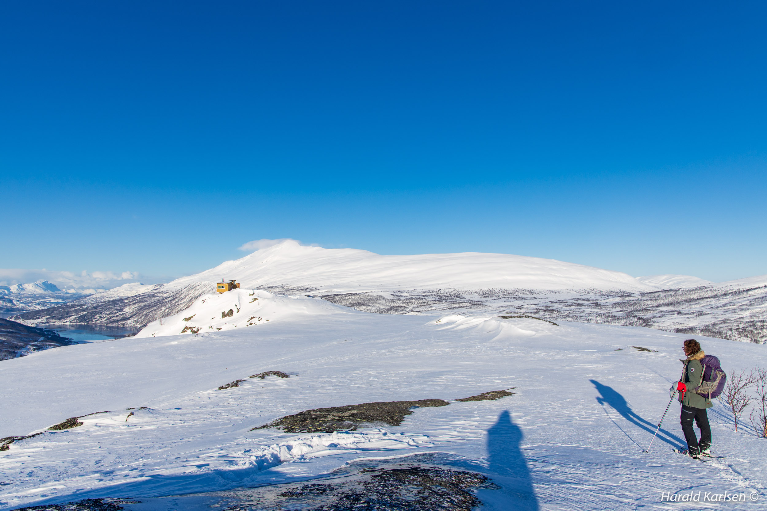 Unfortunately the weather then was very unstable with few days of cold and clear weather. Some clouds is ok though to break up the sky and add life and contrast. Today we had waited long enough, the weather was great, blue sky and minus 14 degrees celsius. So around 9 o'clock we was on our way for todays adventure. We started by the house to the left in the picture. We met one of the persons who had built the cabin and got tips for the best route up the hills.