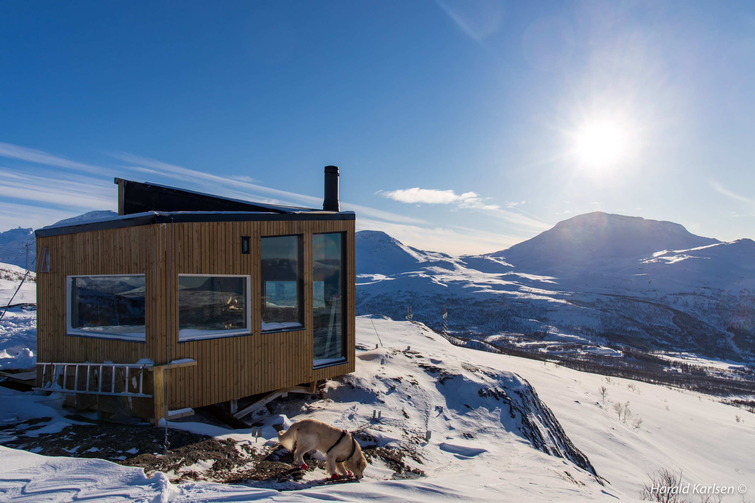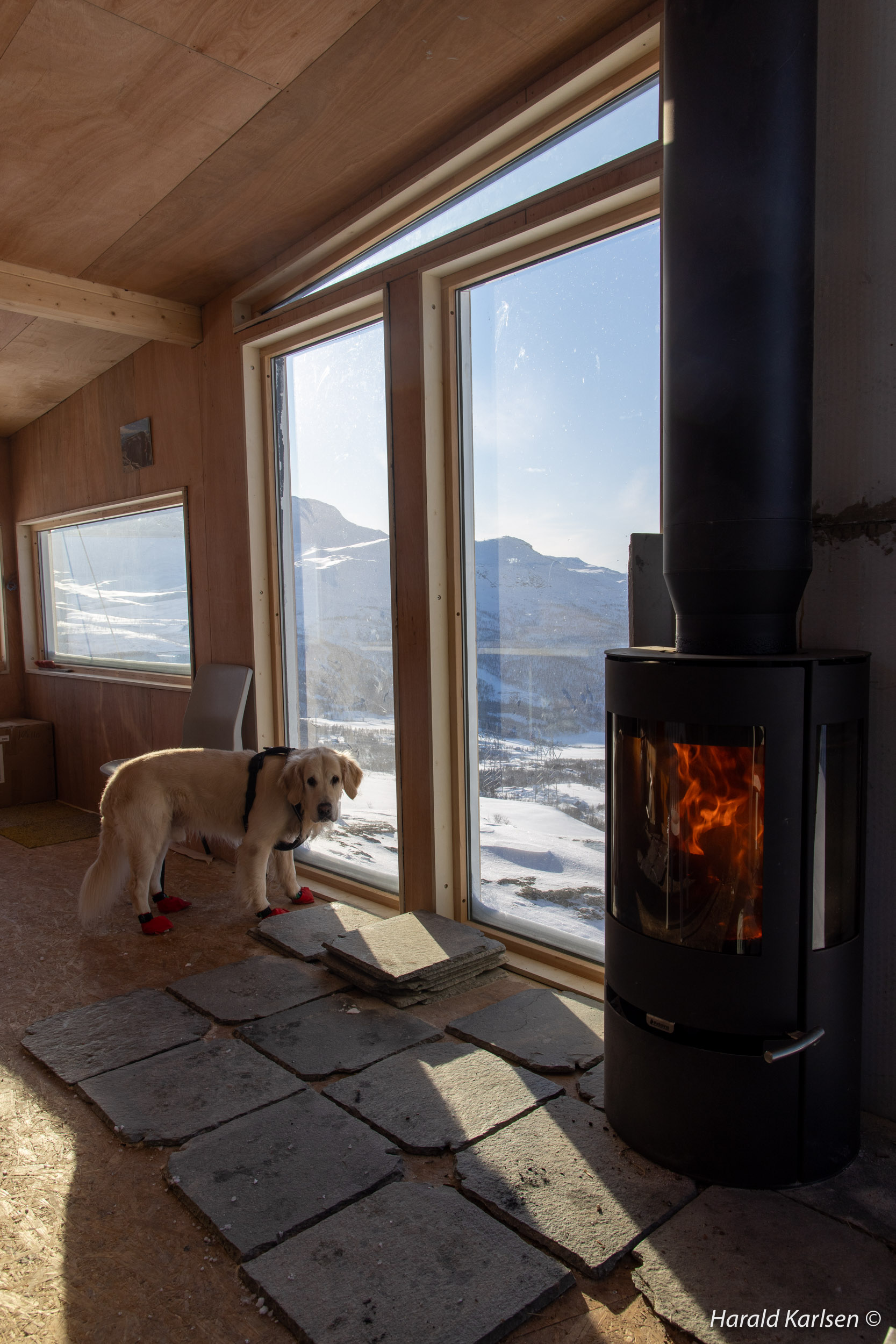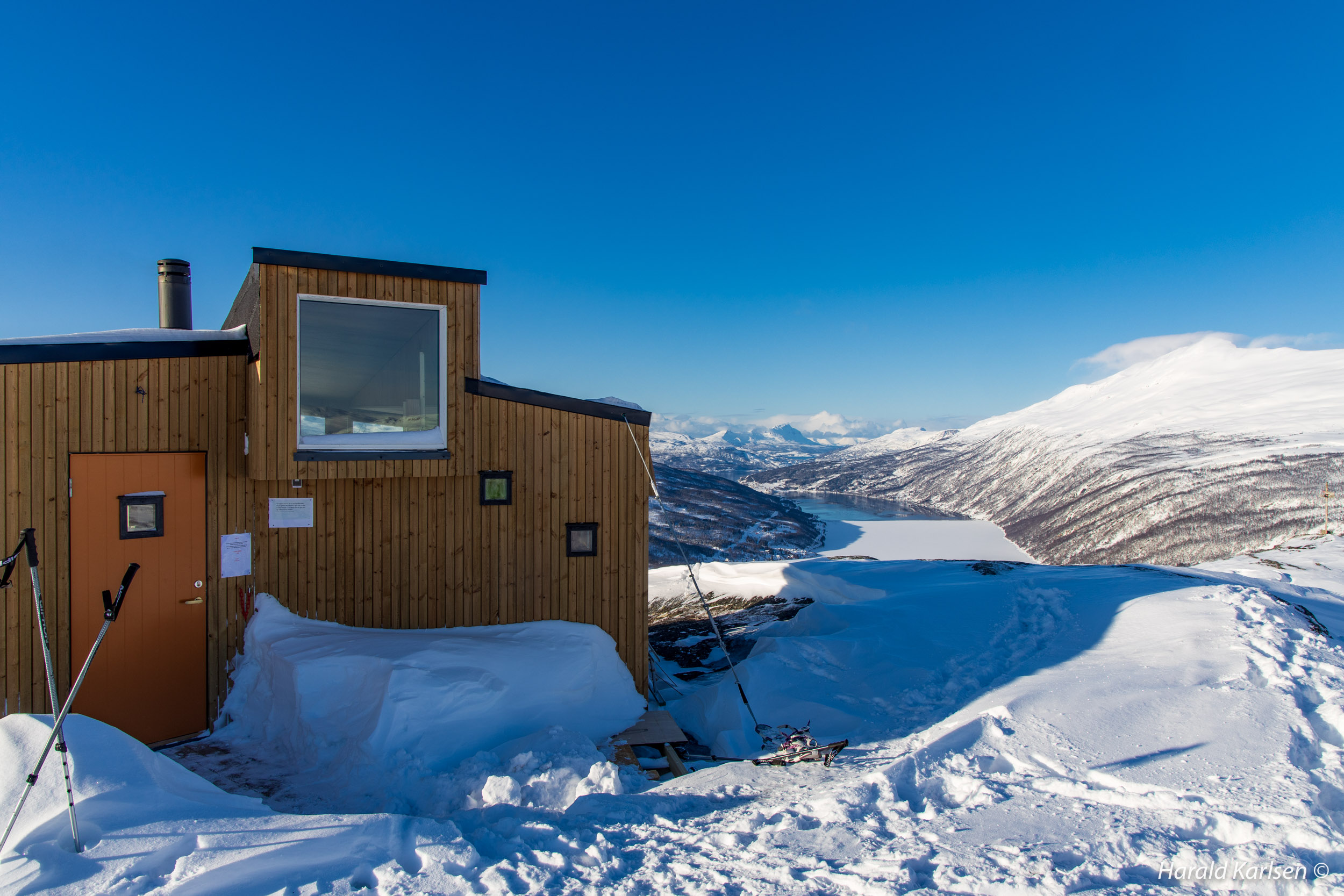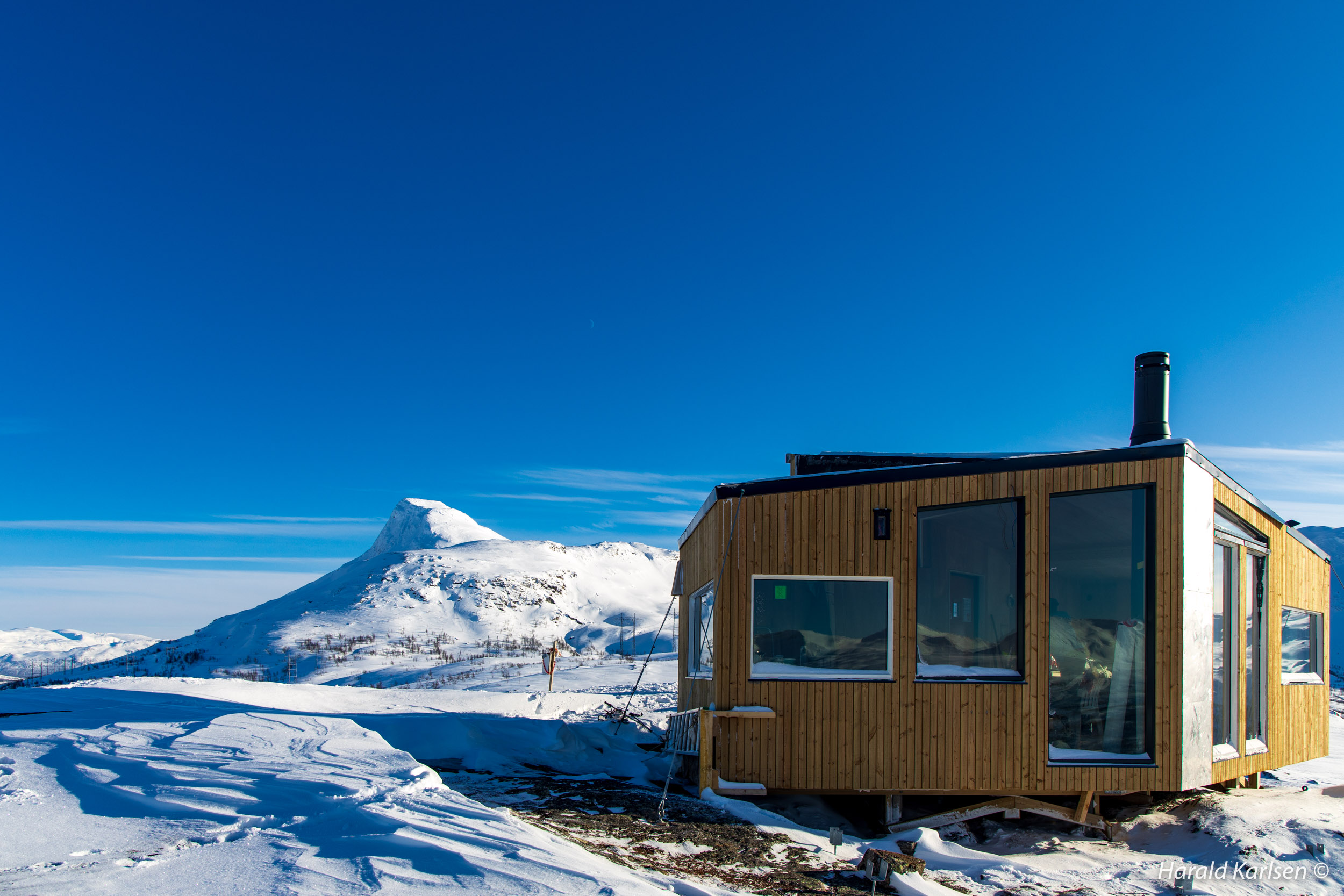 Since around 1940 there have been a cabin up here. When the old cabin was very damaged some volunteers decided to build a new one. An architect designed the new one with big windows, wich give an excellent view toward the fjord and mountains.