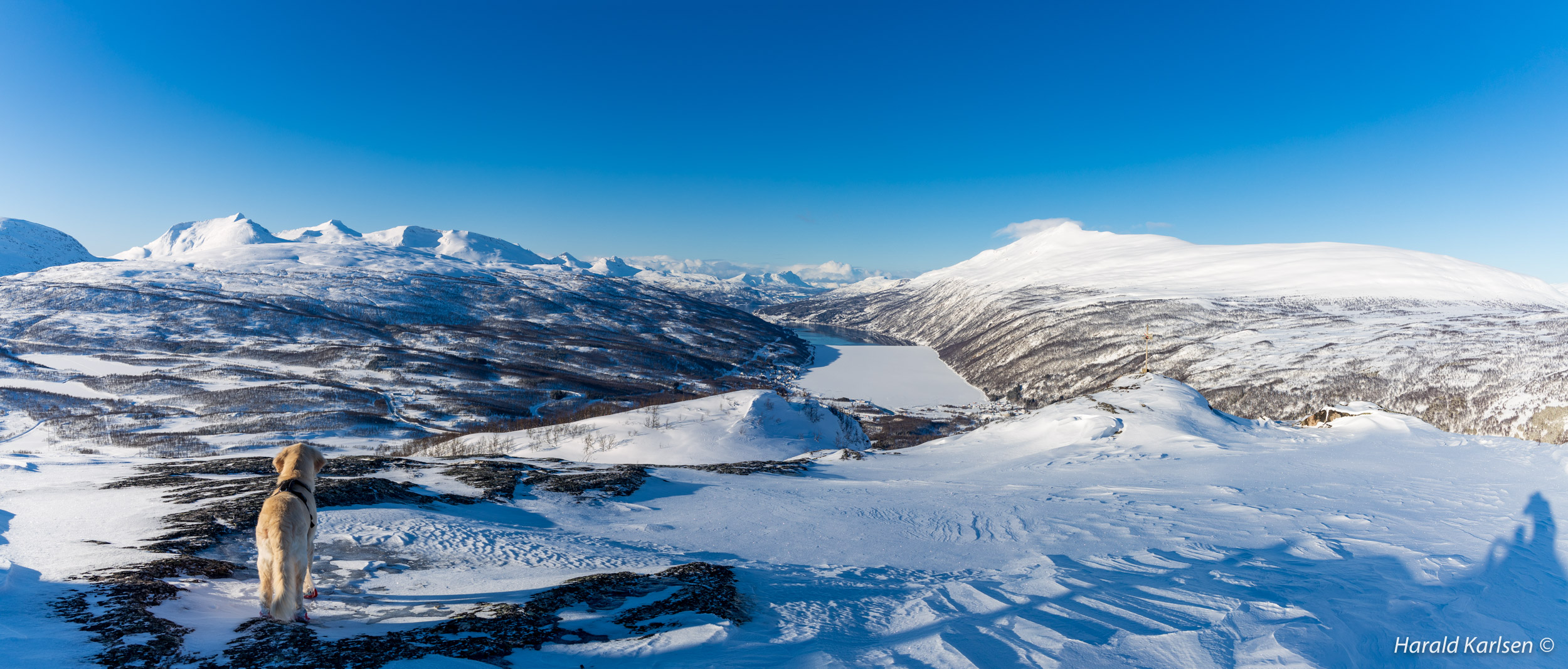 Here I stand in the front of the cabin watching the fjord and the village Gratangen. The picture is a panorama made of 5 shots.