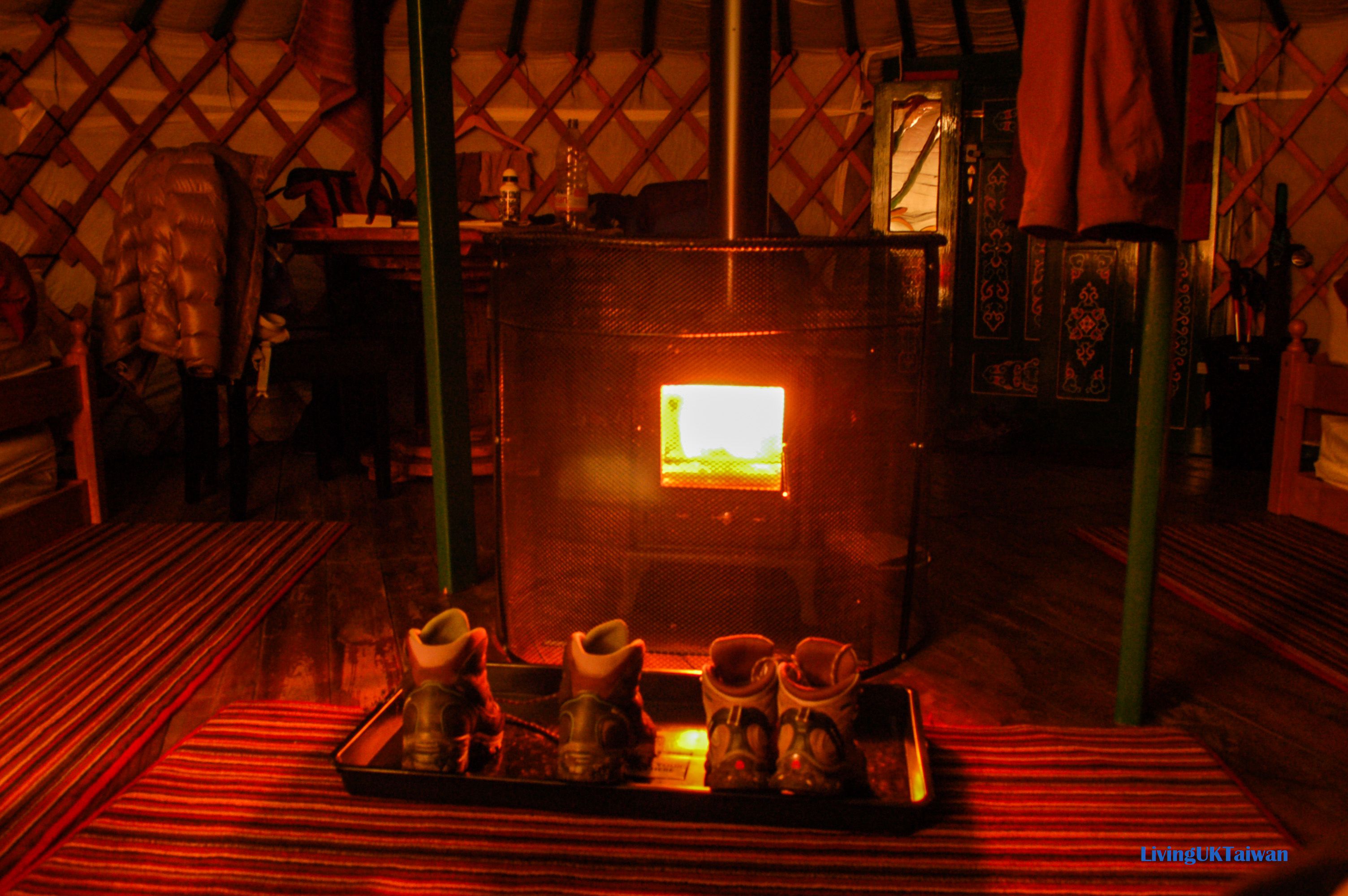 蒙古包裡面掛上了一串串童話燈,既可取光又能加添氣氛,若要再光一點還有露營燈。每一個蒙古包裡有兩張單人床,但可以變做子母床所以最多可以住四個人。大門對面有一張舒適的沙發、一張可以坐五,六人的餐桌,而中心還有一個燃燒著木頭的真火爐。場主很窩心,放了一個電水壺和小小冰箱,裡面有牛奶,可以在蒙古包裡沖奶茶。可惜電水壺是用流動電池,煲水要等很久才熱,直接到外面廚房比較快。但畢竟這是場主的一番心意,非常窩心耶!蒙古包擺設雖然簡單,但感覺相當溫馨和舒適,跟外面伸手不見五指的冰冷夜晚,簡直是兩個世界!