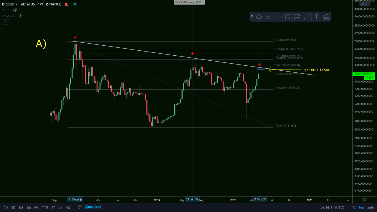 In the first situation (A), I'm using the logarithmic chart to determine the position of the descending trend line. This trend line captures the highest points on previous local highs, marked with a red arrow - Dec 11, 2017 & June 24 2019. As you can see, we're close to this trend line once again and it's probable to interact with it in the upcoming period. If we're going to get another local high at this specific trend line, it's gonna be somewhere between $11000-11500, based on if we're getting there this week or the following ones. Another aspect to look at is the 0.5 Fibonacci retracement level ($11500) of the Dec. 2017 - Dec. 2019 price movement. Keep in mind that the previous local high - June 2019 - reached exactly the top of the golden pocket ($14000) of this same Fibonacci retracement; therefore, reaching now the 0.5 if quite possible.