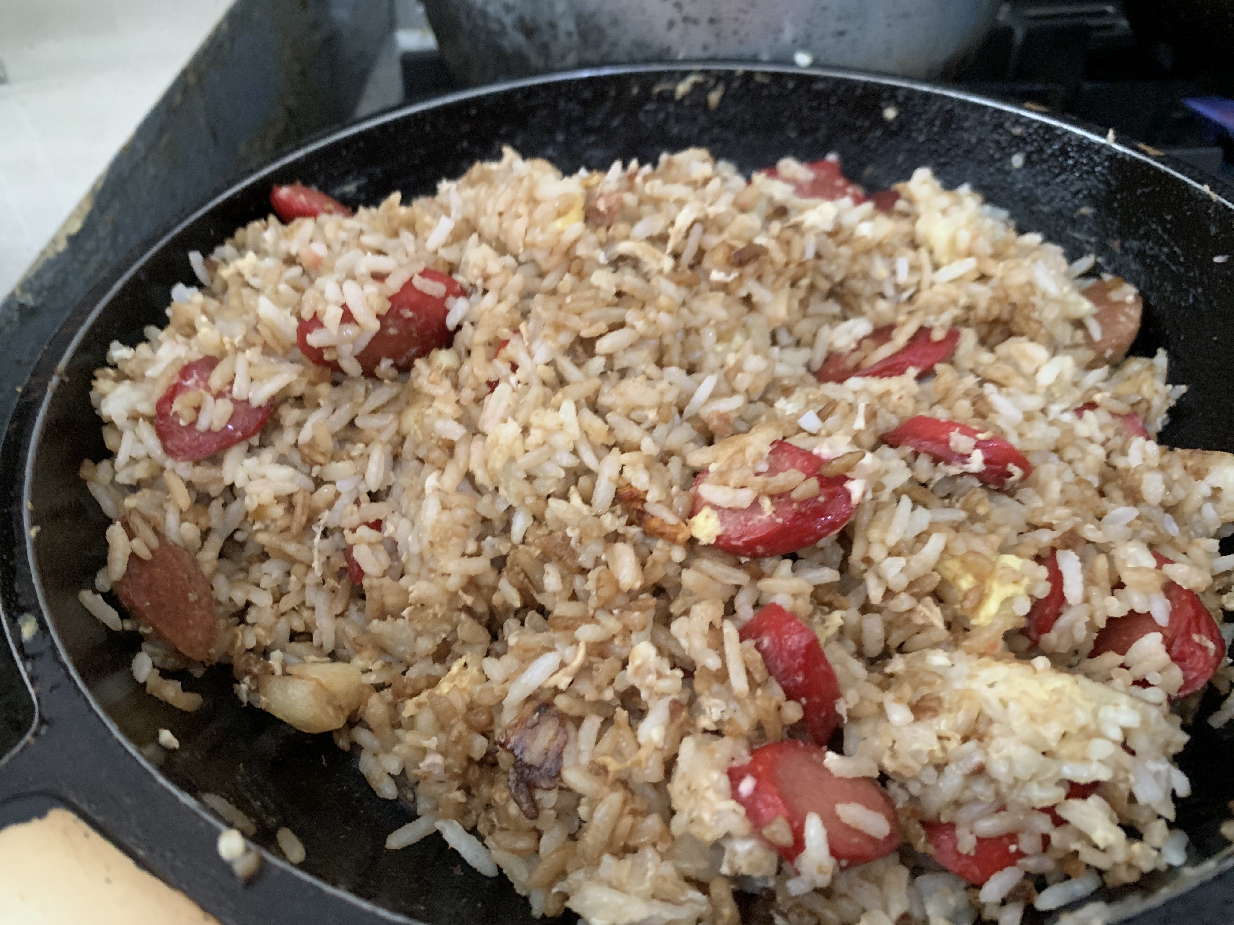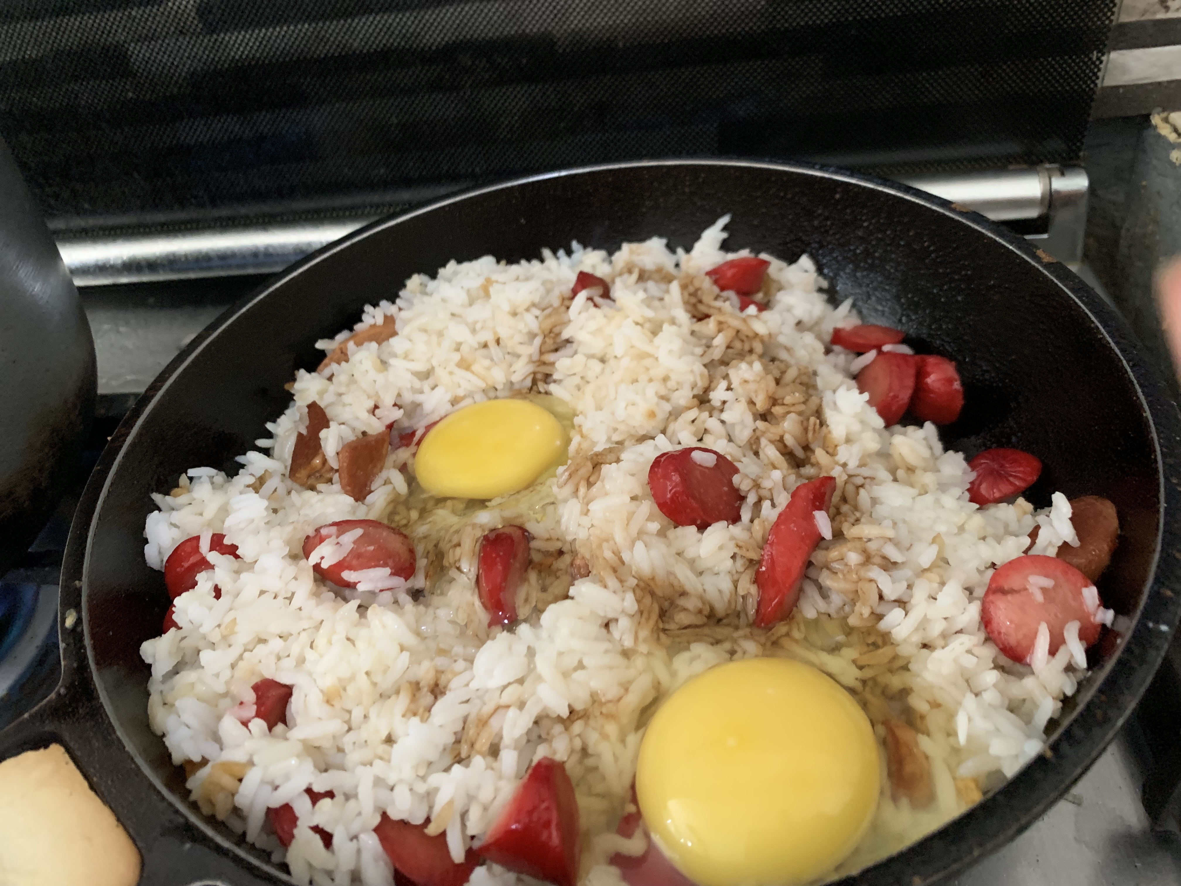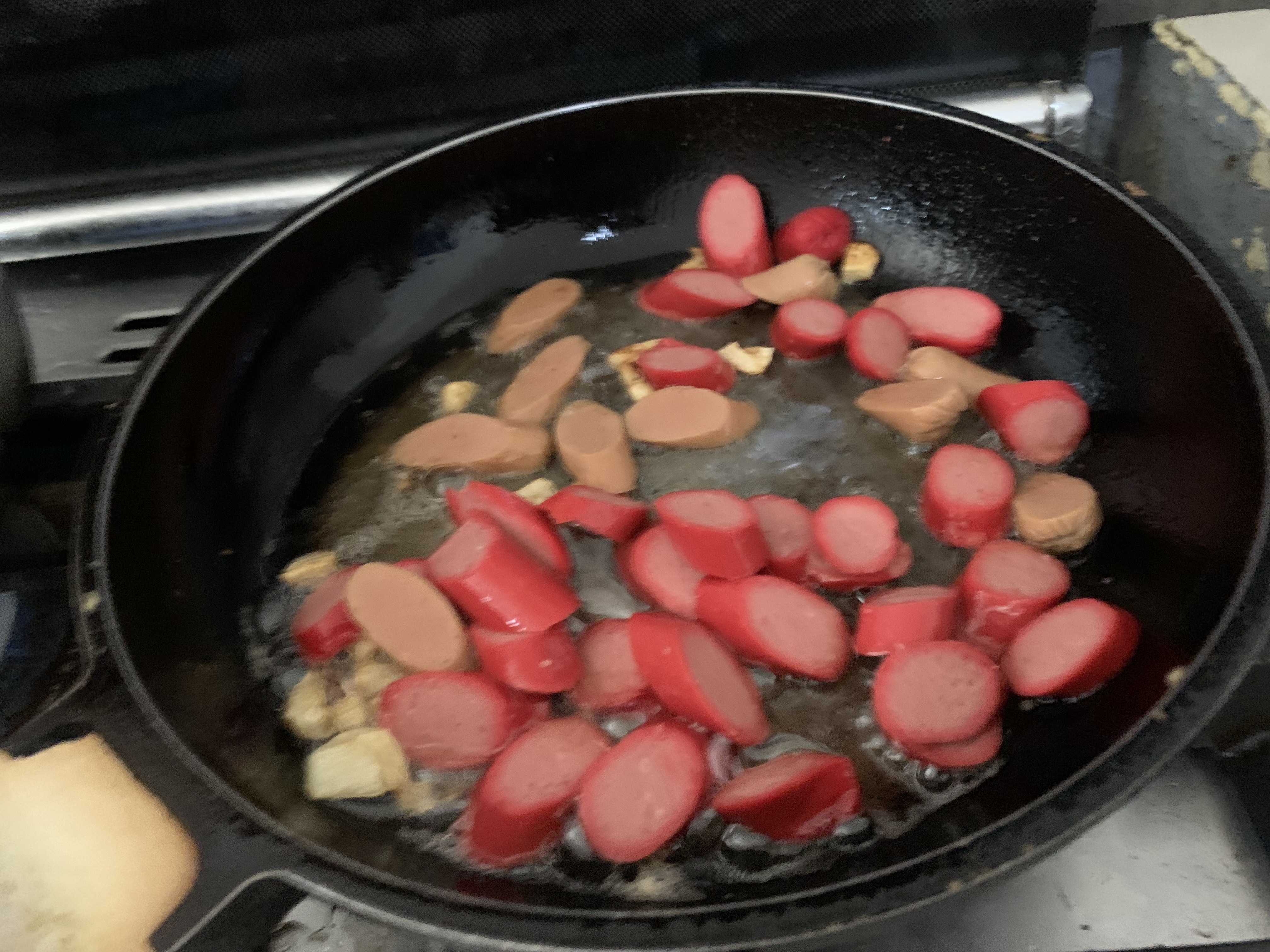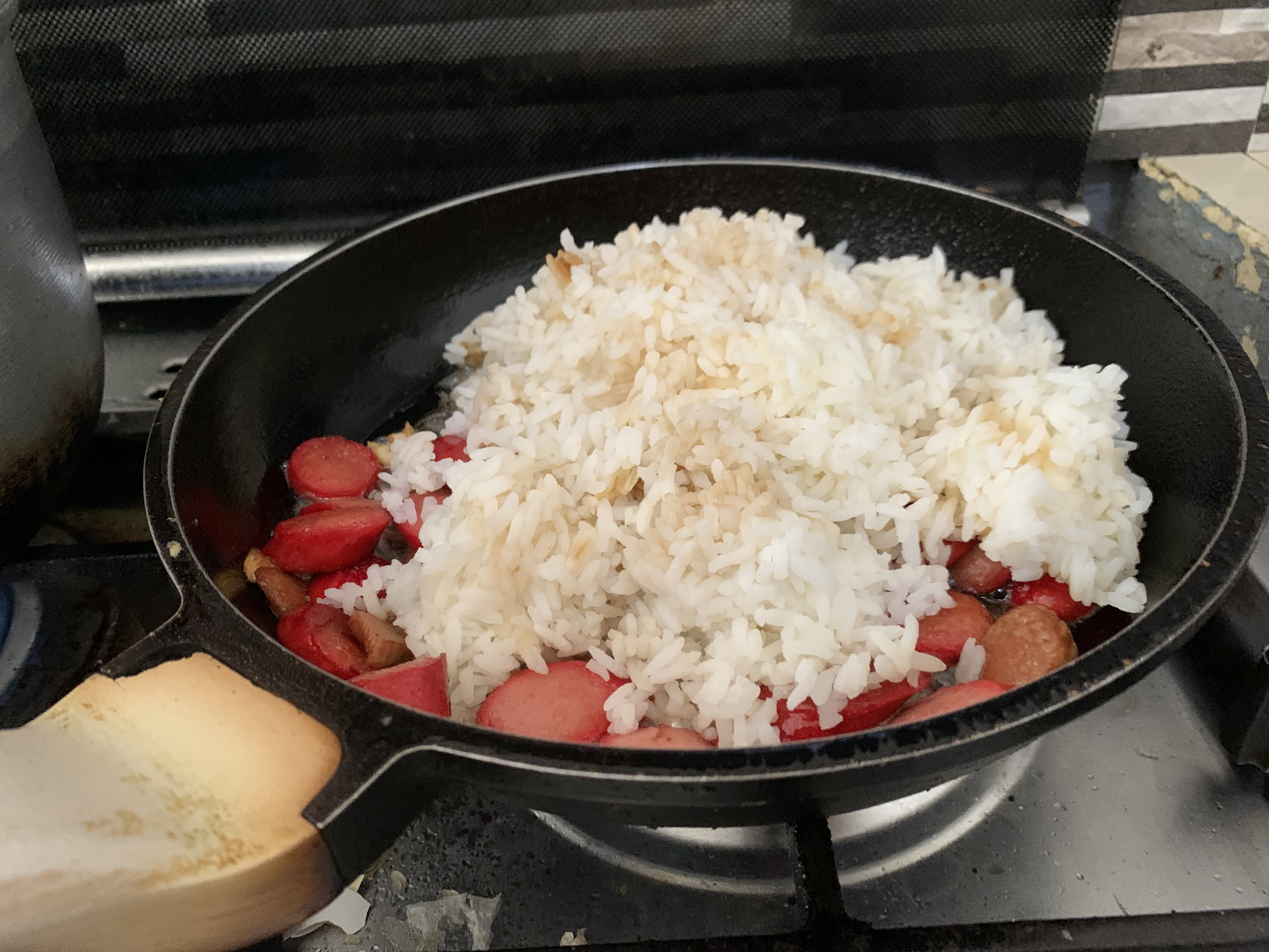 Then slowly put the rice and mix it with your cooked hotdog and sausage.