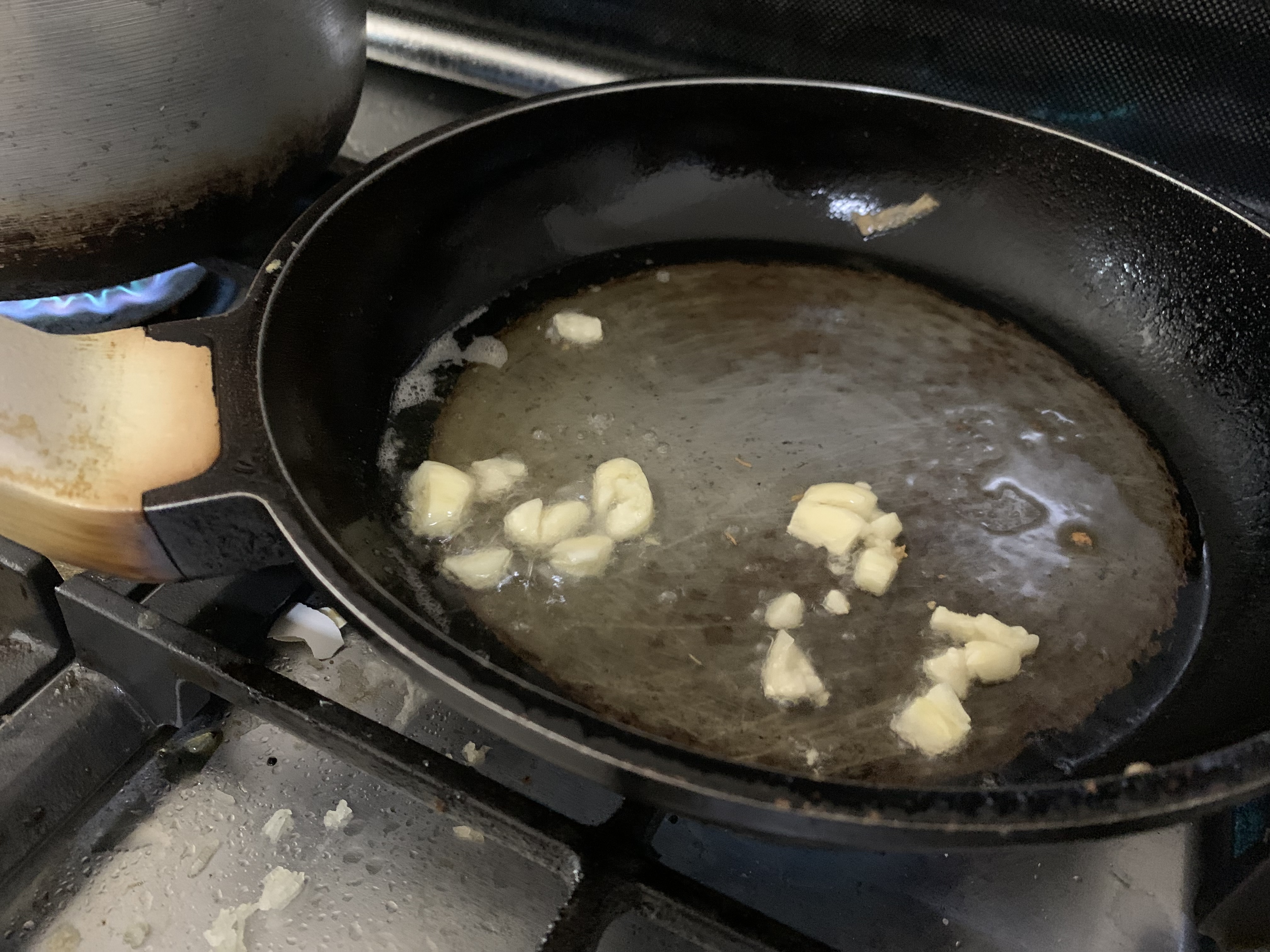 In a frying pan, put a little amount of oil and boil it. Some used butter for a better fragrance and will add taste to the fried rice. Then saute a garlic and onion until it reaches golden brown in color.