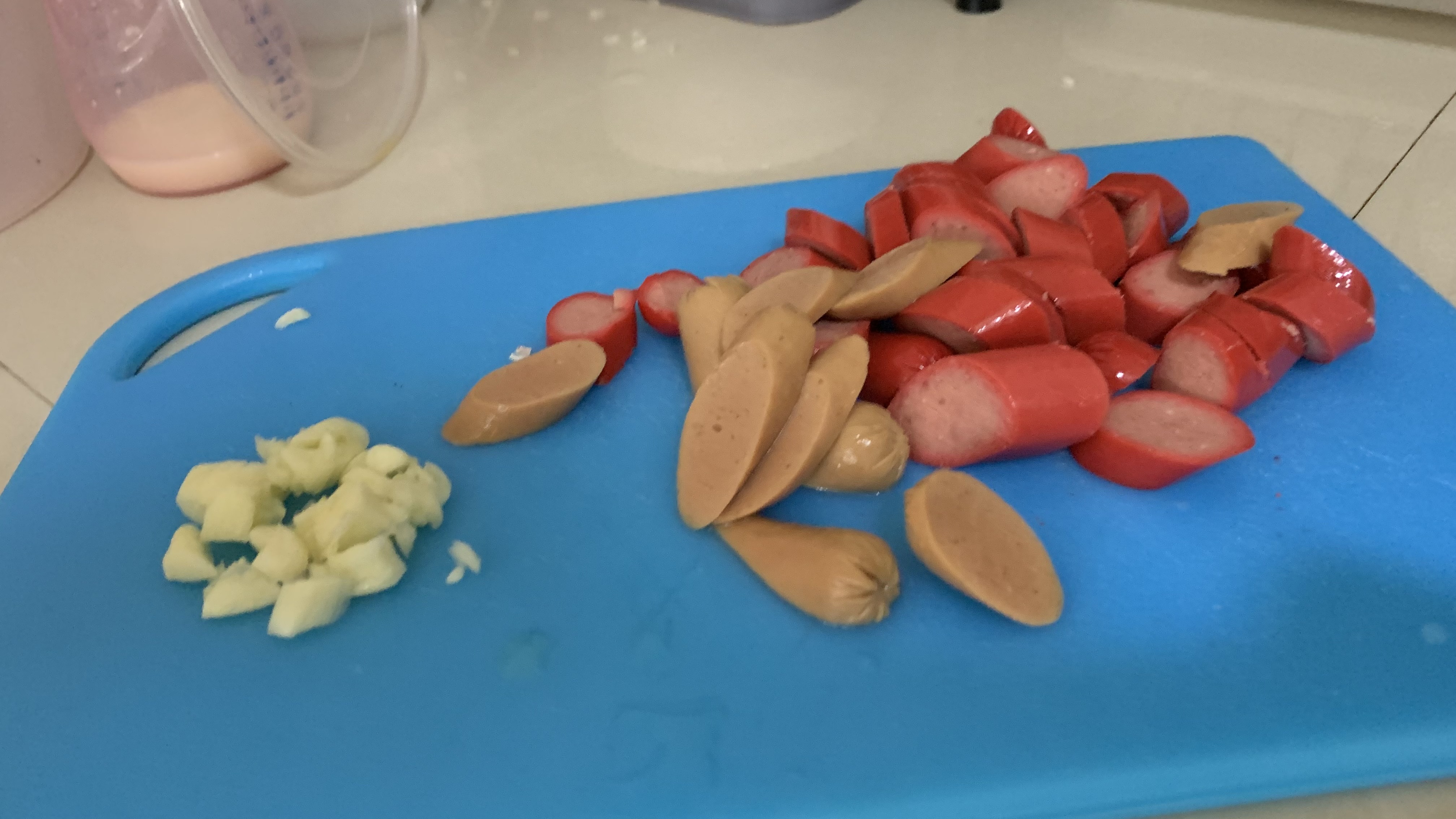 Then, fry first the hotdog and sausage so that when you will put the rice it is already cook.