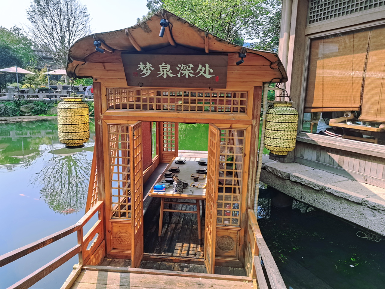 餐厅的内部装修偏木质结构,有竹编的灯笼和屏风,来得巧的话还能看到仙女姐姐弹古筝。我没在晚上来过,听说晚上这边的灯光映照着湖面,随手拍都是电影画面。