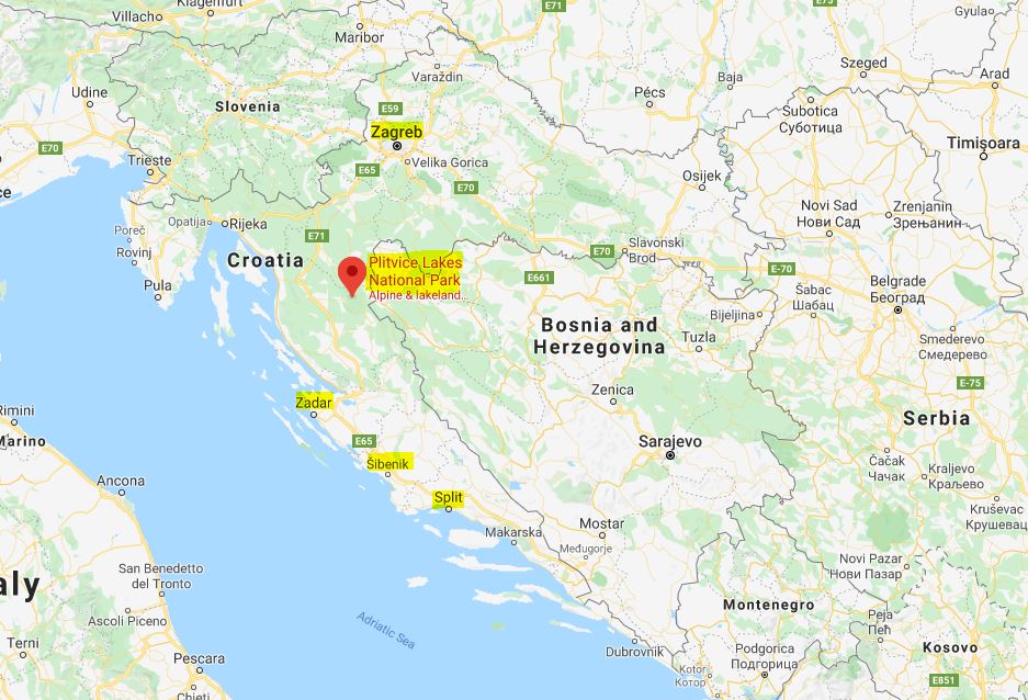 on the above map, other previously introduced destinations Zagreb, Plitvice Lakes National Park, Vodice, Sibenik에 이어 남쪽으로 이동합니다.