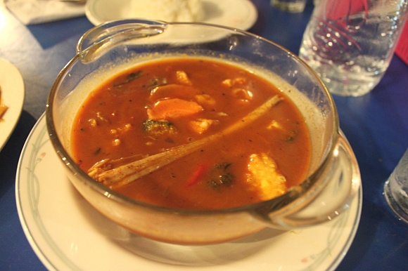This is Tom yum kung soup. It is also one of the top three soups in the world, although it has a sour taste with lemon grass. So, It was unfamiliar, but tasty.