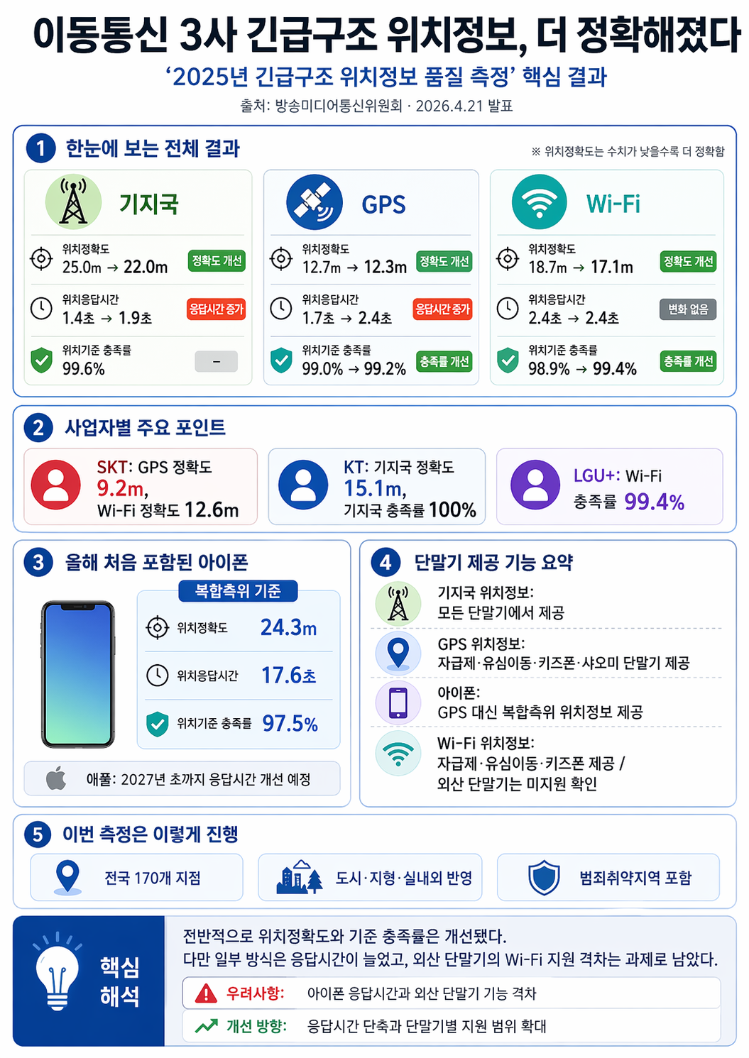 방송미디어통신위원회가 공개한 ‘2025년 긴급구조 위치정보 품질 측정’ 결과에 따르면, 소방·경찰 등 긴급구조기관에 제공되는 이동통신 3사 위치정보의 정확도와 기준 충족률이 전반적으로 개선된 것으로 나타났습니다. 이번 측정은 전국 170개 지점에서 기지국, GPS, Wi-Fi 방식과 애플 아이폰의 복합측위를 대상으로 진행됐습니다.