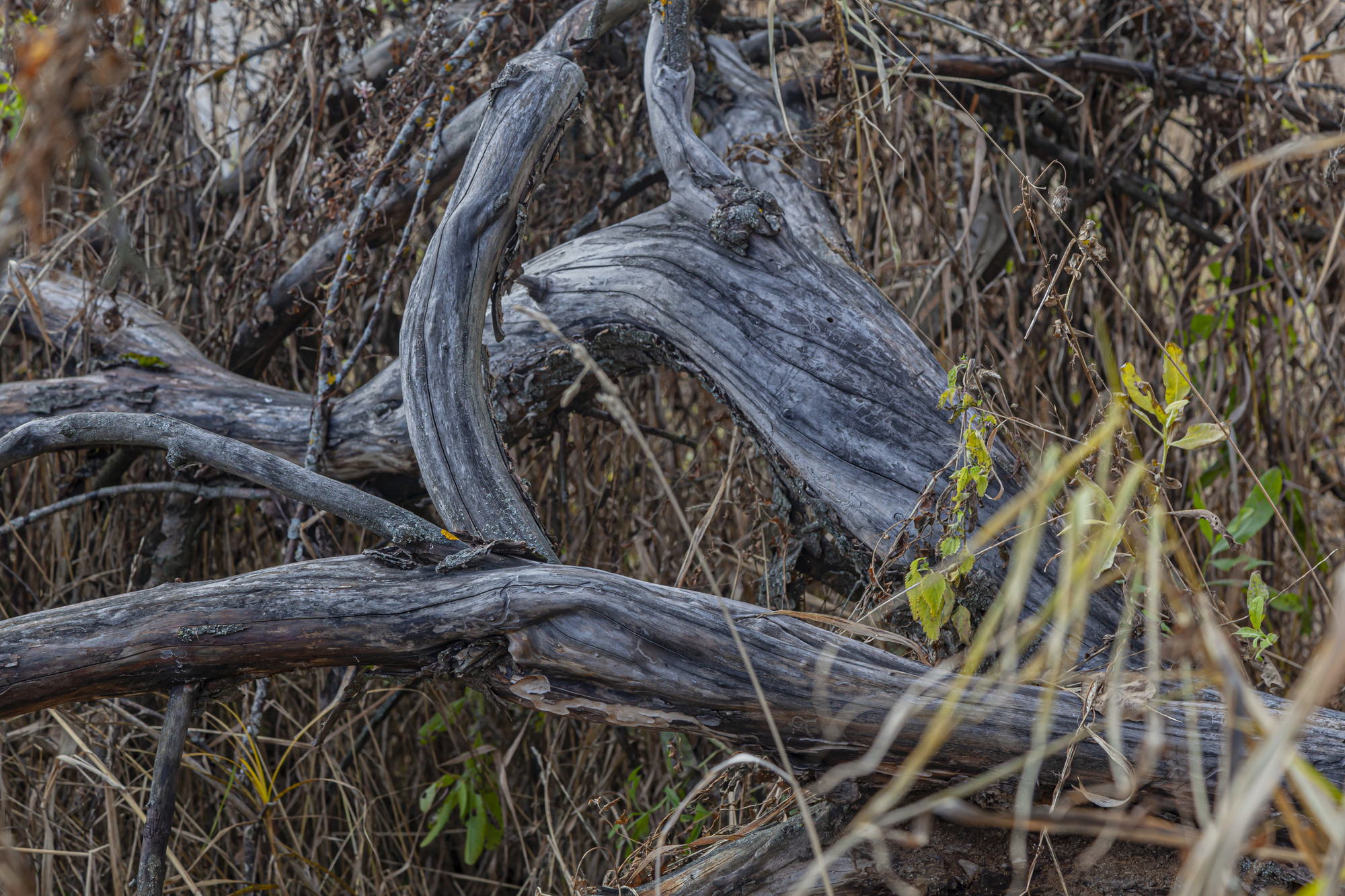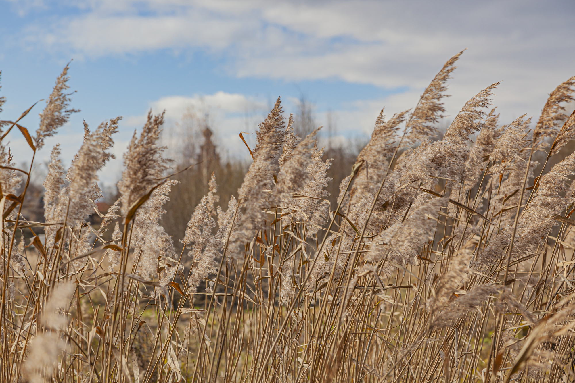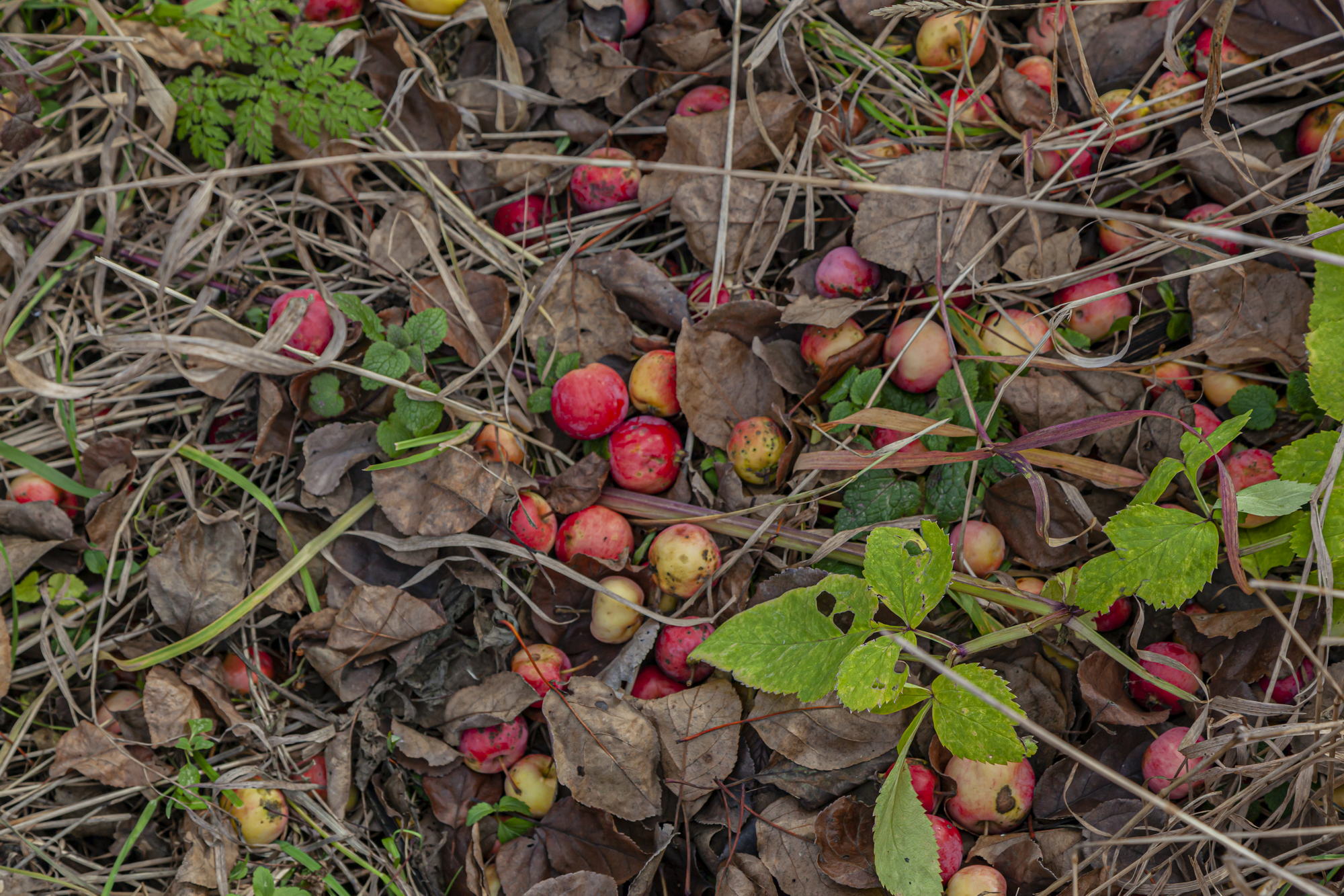 These meadows are overgrown with grasses. In the fall, these tall grasses are all yellow and look very pretty as they sway in the breeze. And along the banks of the river there are many wild apple trees strewn with red fruits. This is very impressive, since there are almost no leaves on the trees.