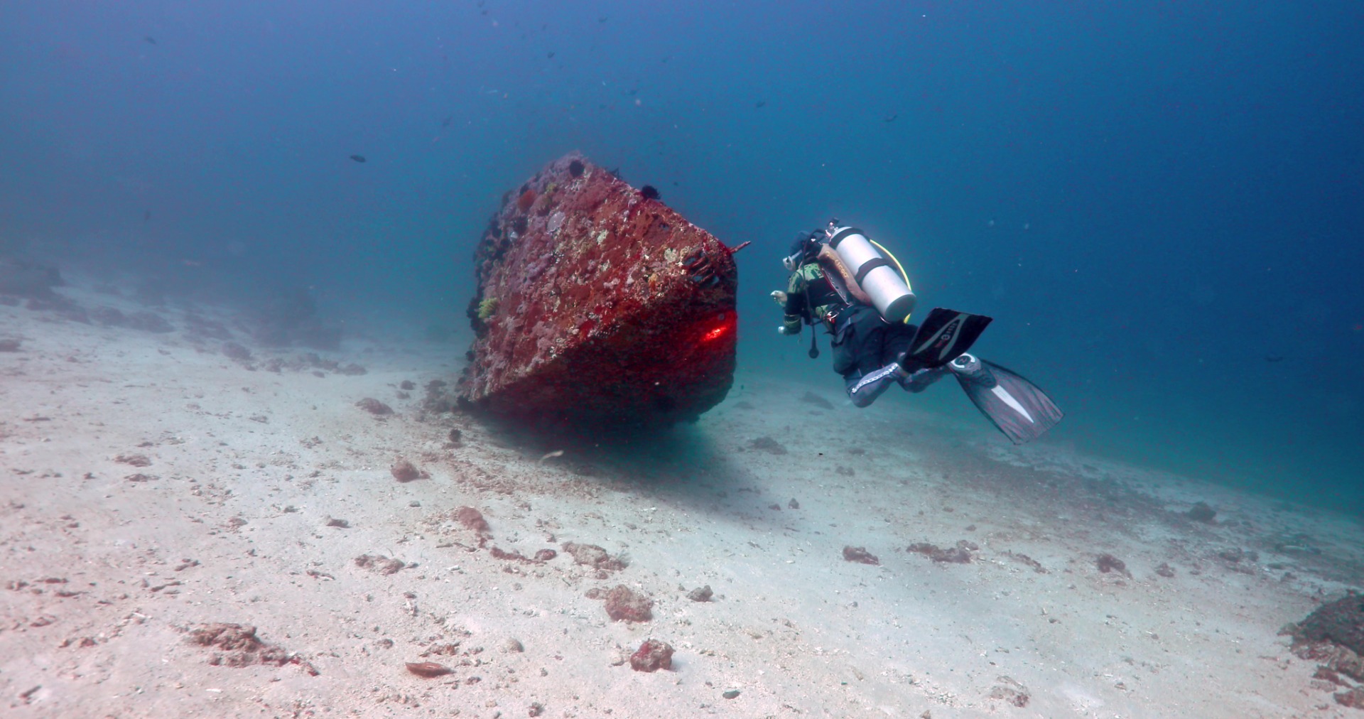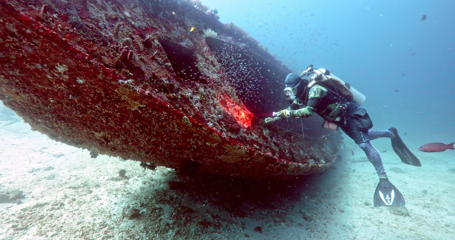 One of the highlights here is a magnificent 6-meter long shipwreck resting on its side. This intriguing sight adds an element of mystery and serves as a haven for various marine species seeking shelter amidst its rusted hull.