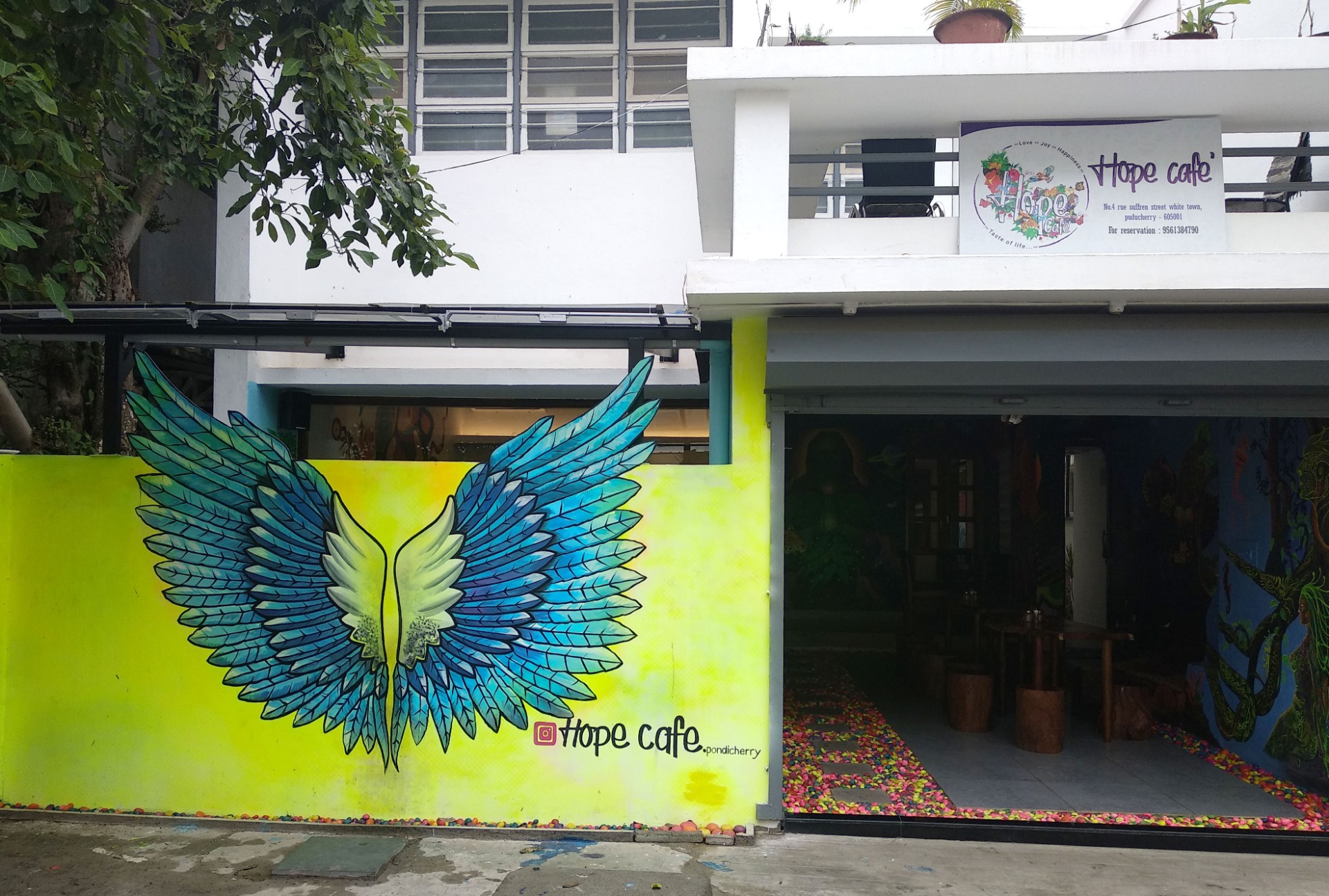Most cafes also have colourful paintings and art which makes it a social media hotspot. Hope cafe has this huge angel wing right outside their cafe. There are other cafes, both courtyard ones, and closed ones.