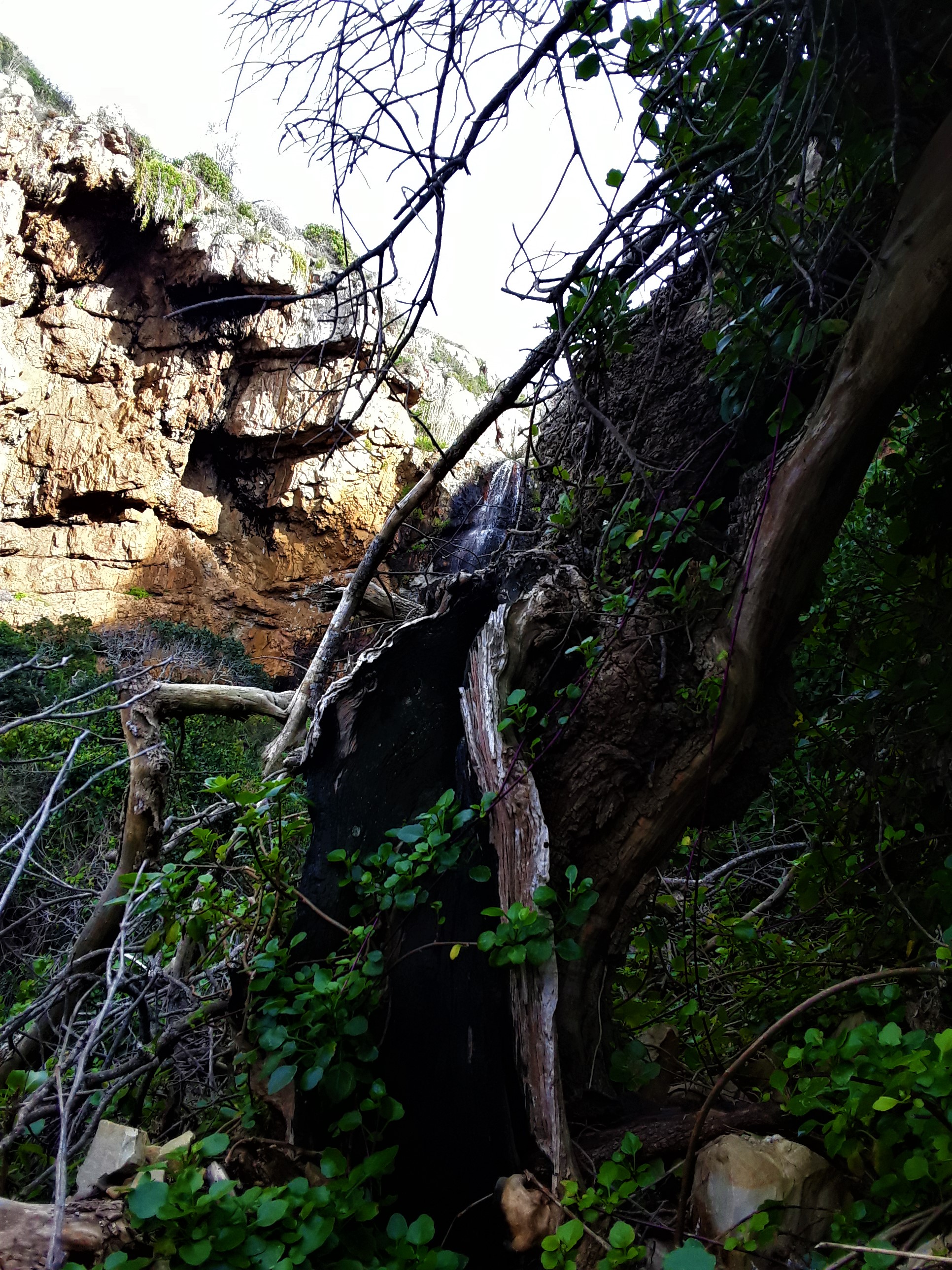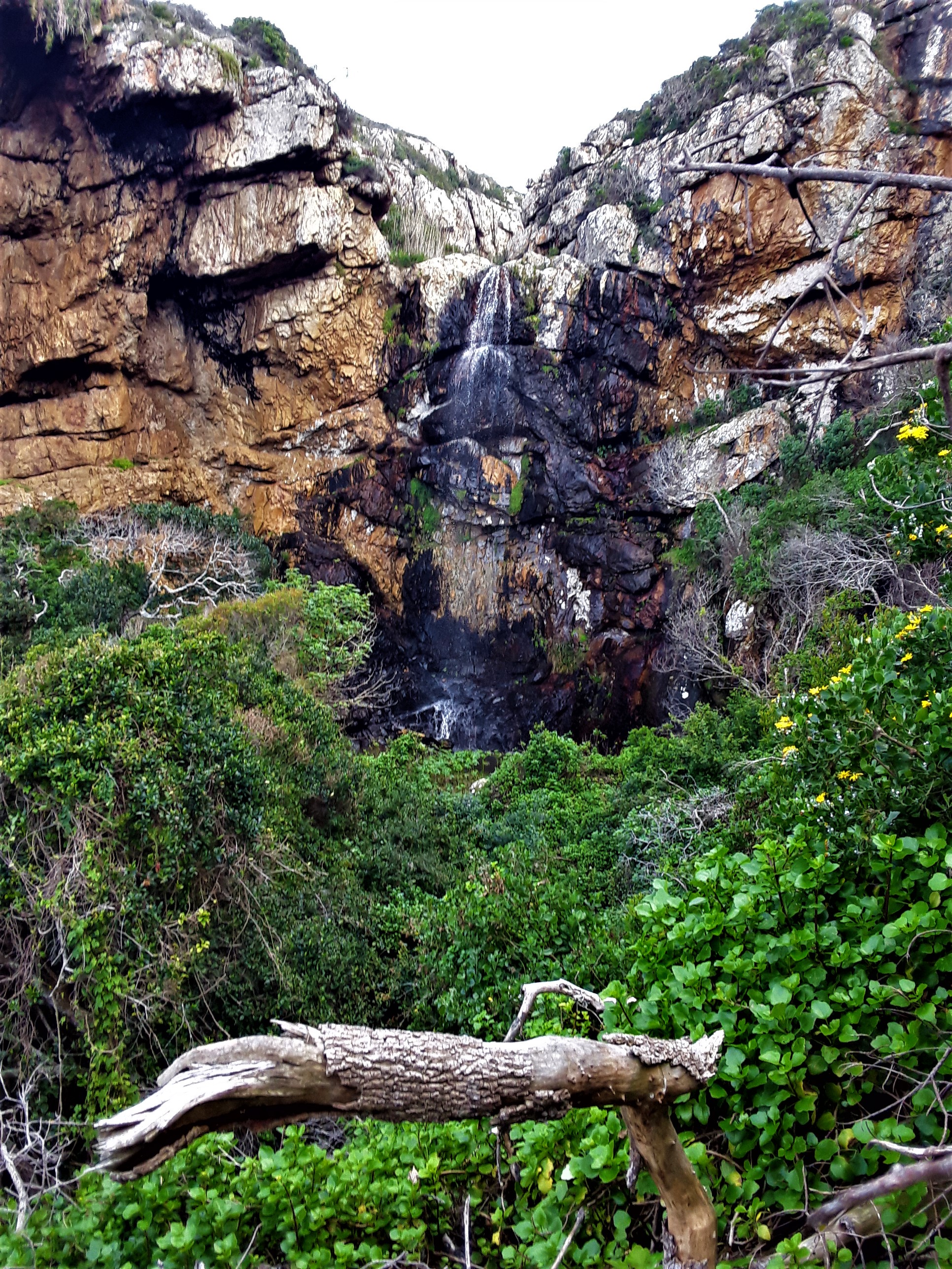 You can see the waterfall in the background behind this tree stump of you look carefully. There was a fire that raged through here in 2017 and most of the plant life was burnt. Some dead tree stumps still remain. However, the indigenous floral species have bounced back and now all that reminds one of that devastating fire are these occasional blackened tree stumps enveloped by fresh green growth.