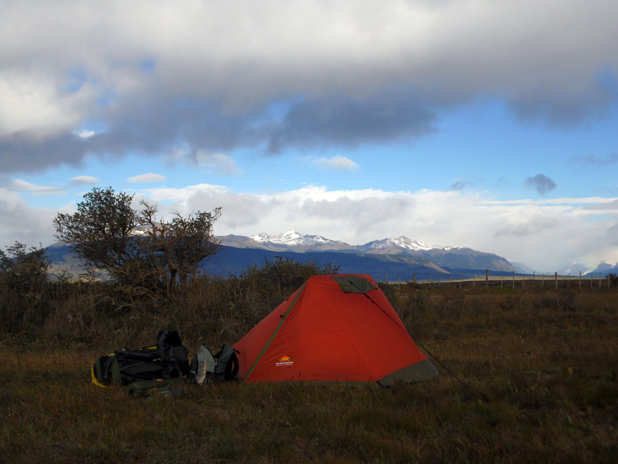 The unique view of the landscape completed me with contentment after the Jeep trip. The gulf and the snow-capped mountains on the horizon. The frigid air and the fast moving clouds. Vegetation was in between arid and summer-ish, a mix of tawny and military green colors. I rambled on the fields heading to Torres del Paine ― if not by the coming wind and the darkening sky I would’ve walked into the backcountry. However, I looked to the dark formations spilling out from the peaks; the clouds movement suppressed the least sunrays remaining. There wouldn't be much time before the storm. I unpacked everything and sprinted to pitch the tent, right there, on that spot overlooking the mountains. If it was allowed or not I didn't care, the goal was to escape the coming drench.