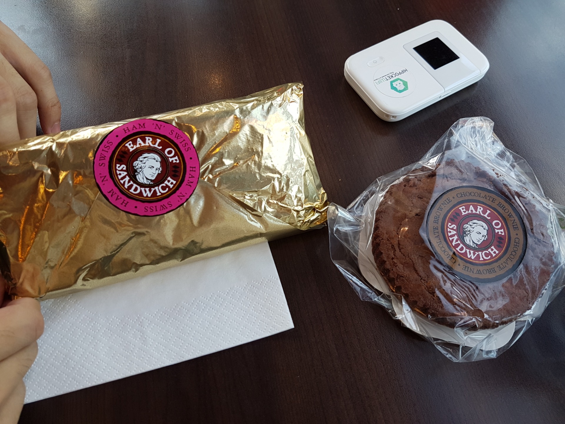 So we decided to get a snack since the food at Disney is really expensive. We bought a Ham and Swiss sandwich and a chocolate brownie to share.