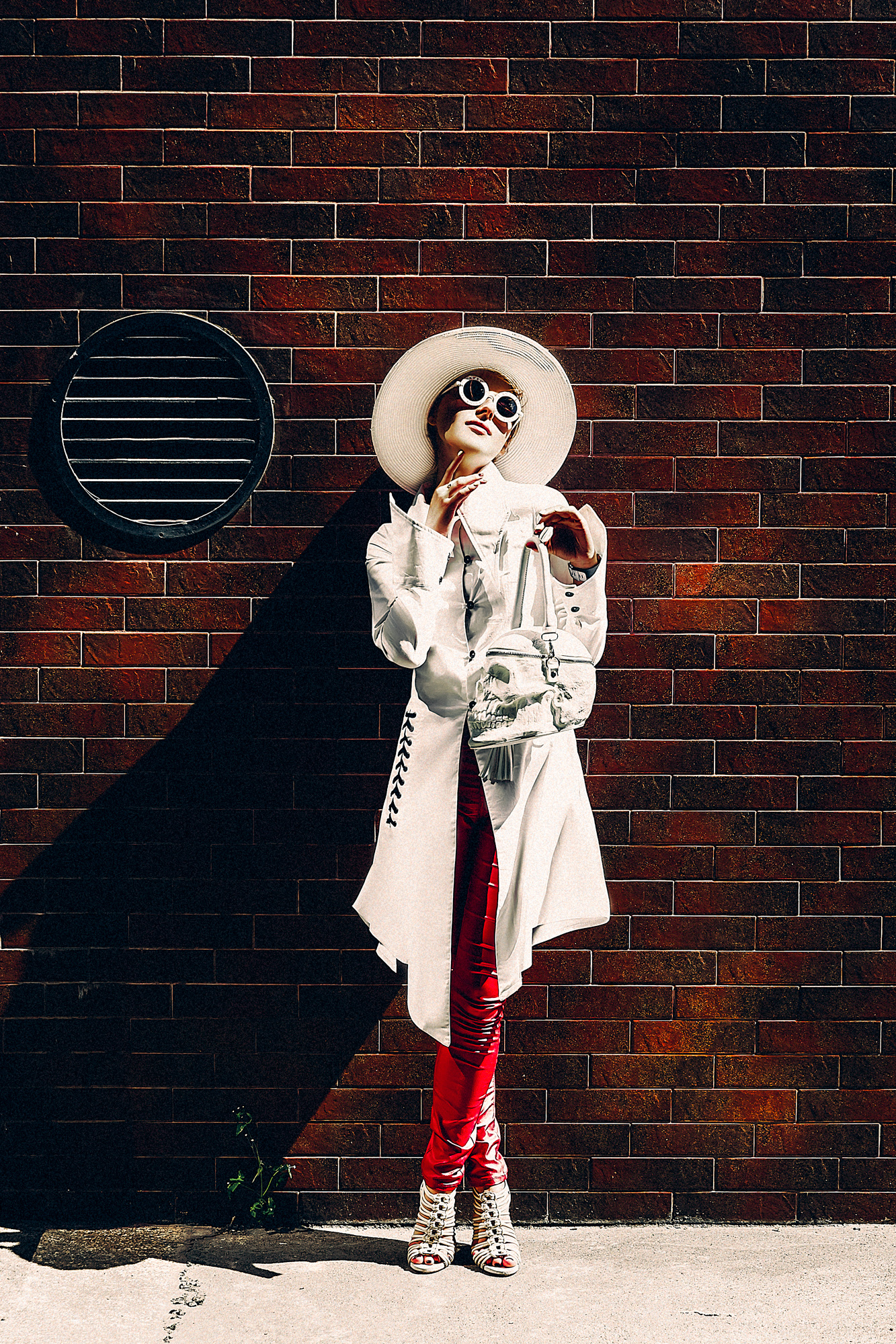 Street art fashion portrait. Pretty cool color contrast. complete designers outfit including very special hand bag ;)